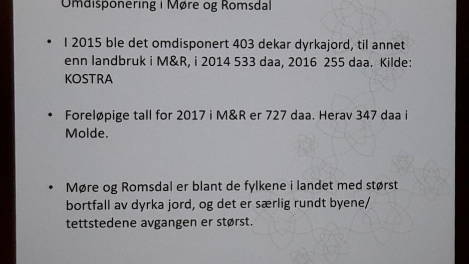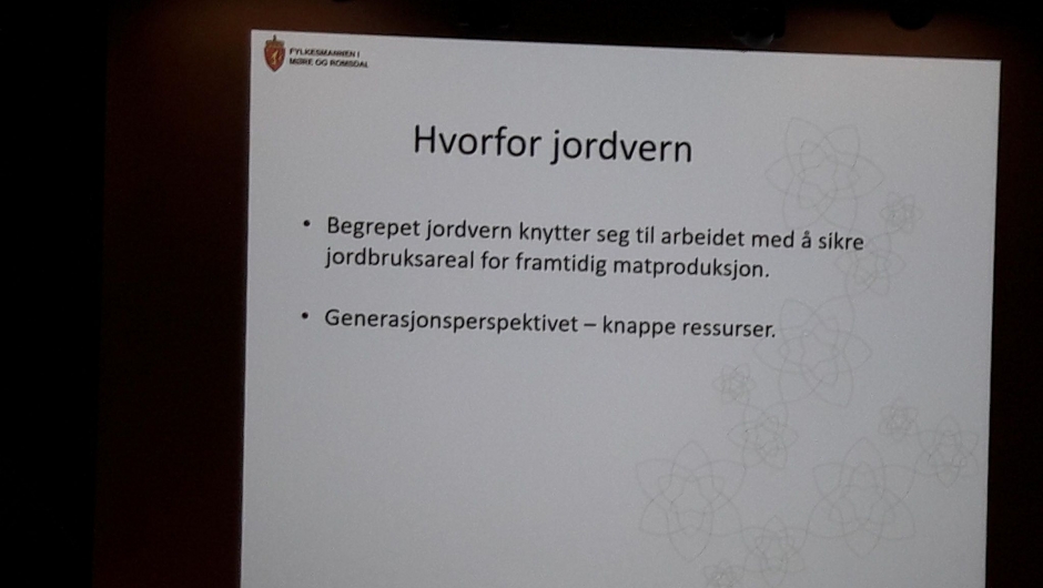 Ordfører i Norddal Arne Sandnes ønsket alle velkommen. Fylkesmann Lodve Solheim hadde opning av konferansen. Vår tidligere forsvarssjef Harald Sunde hadde et foredrag om jordvern - viktig rolle av totalforsvaret. Landbruksdirektør Frank Madsøy hadde et foredrag om jordvern og matberedskap i Møre og Romsdal.