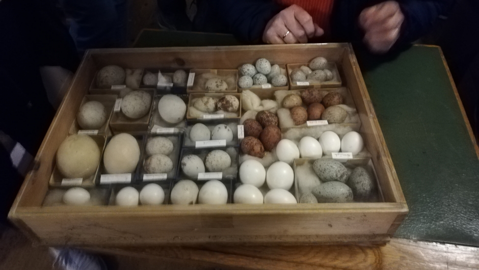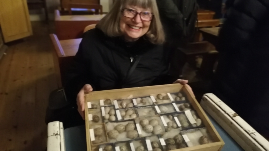 Etter dette ineressante bildeforedraget gikk vi over til den gamle skolestua. Grunnen til at vi hadde lagt møtet til Janløkka, er at i den gamle skolestua (bygget i 1844) finnes den en unik samlig av fugleegg. Her tok Anne Joronn Sæthre imot oss og lot oss få granske den enorme samlingen egg. Her var det alle størrelser fra store som erter til egg som var mye større enn et vanlig hønseegg!