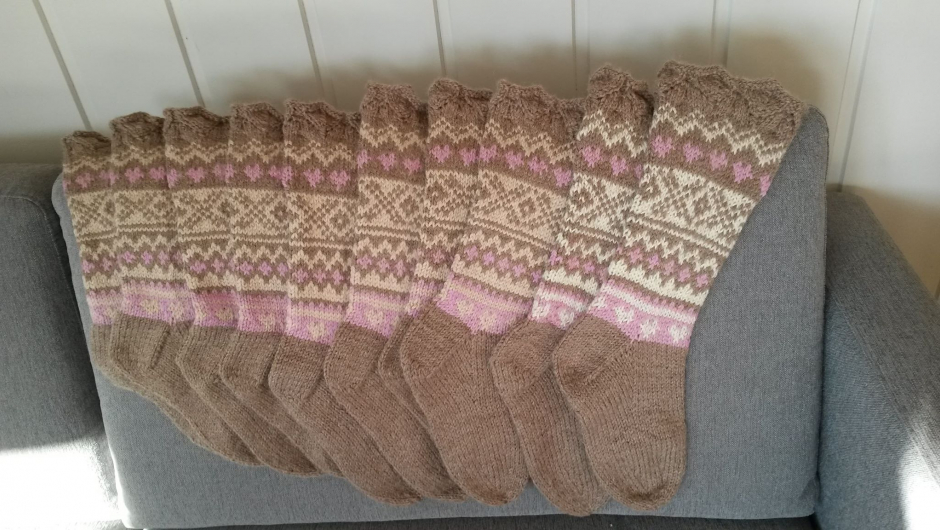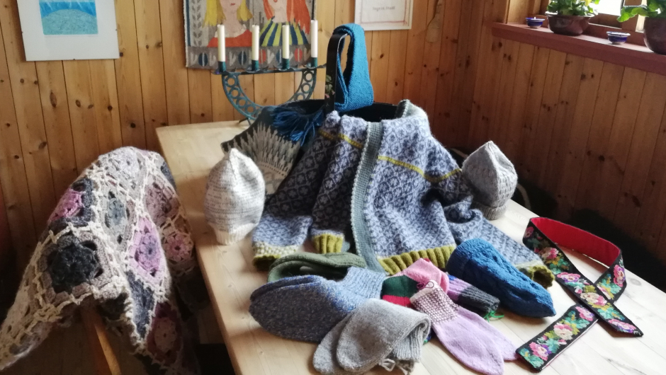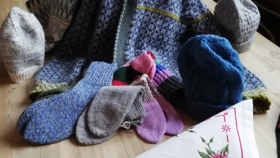 Produksjonen vår er stor, og siden vi som sagt er damer i vår beste alder, har vi selvfølgelig ikke bruk for alt vi lager selv. De som blir tilgodesett er selvfølgelig barn, svigerbarn, barnebarn og oldebarn, men jeg kan også nevne andre som har fått av vårt overskudd: