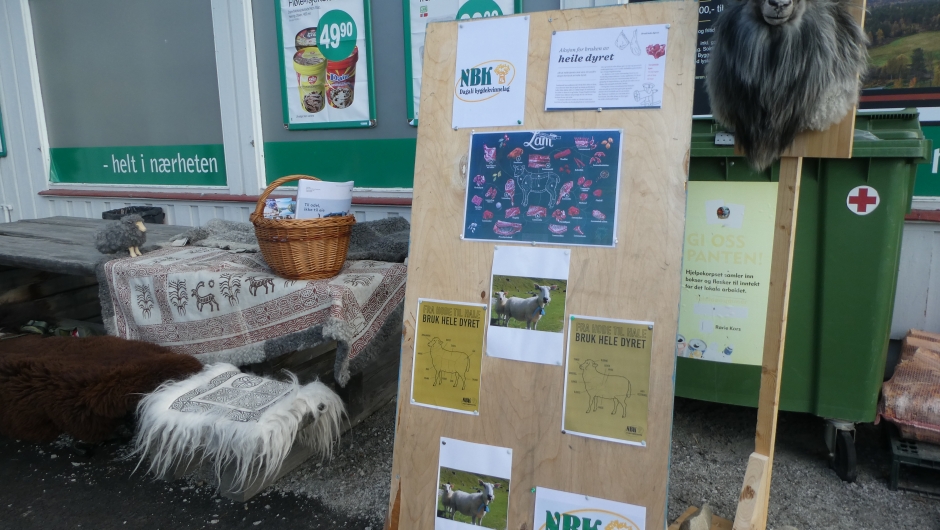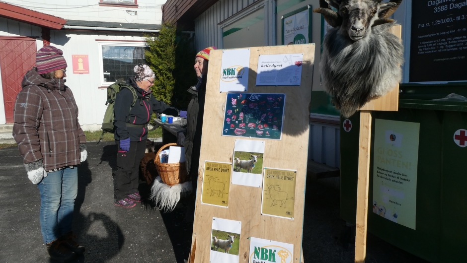 Det ble delt ut brosjyrer fra aksjonen til NBK "Bruk hele dyret". Det var mange hyggelige og positive folk ,- hyttefolk og fastboende. Noen fortalte de skulle ha saueskank til middag, eller får i kål eller lammecarré. Det var ikke bare det flotte sauehodet vi hadde med som interesserte folk; Oppdelingsguiden av lam ble studert, det samme ble skinnfellene som var tatt med. Det ble en fin markering utenfor butikken.