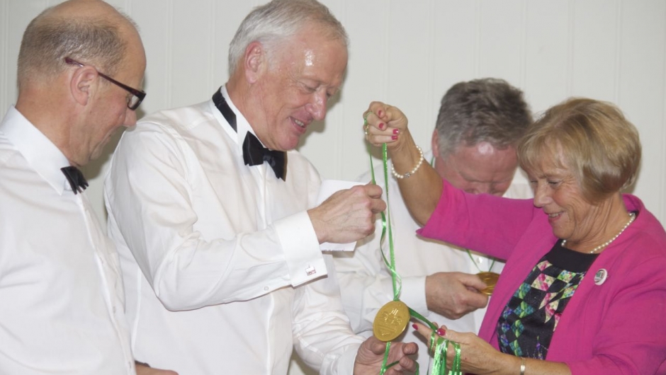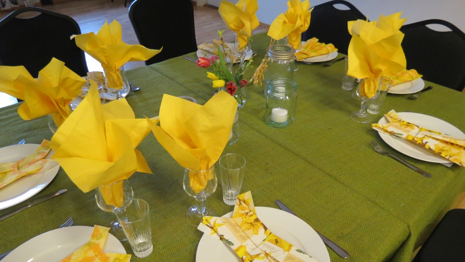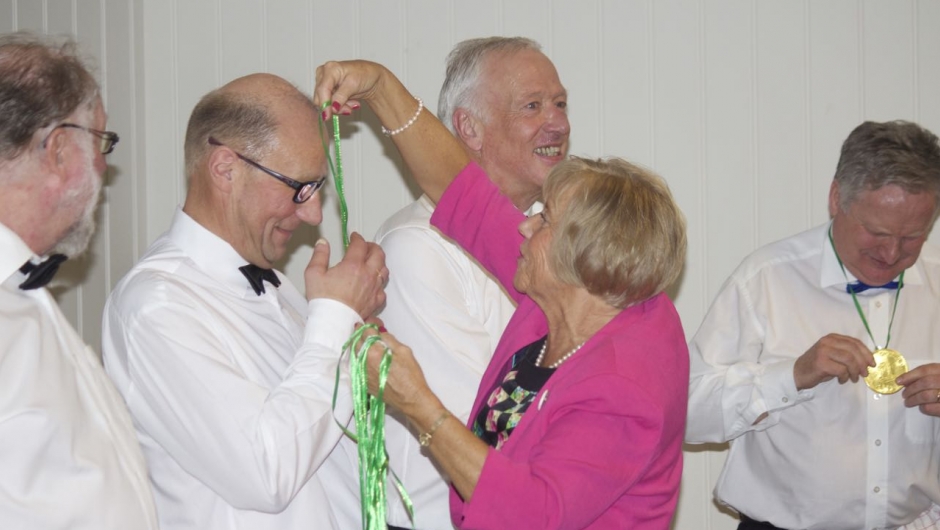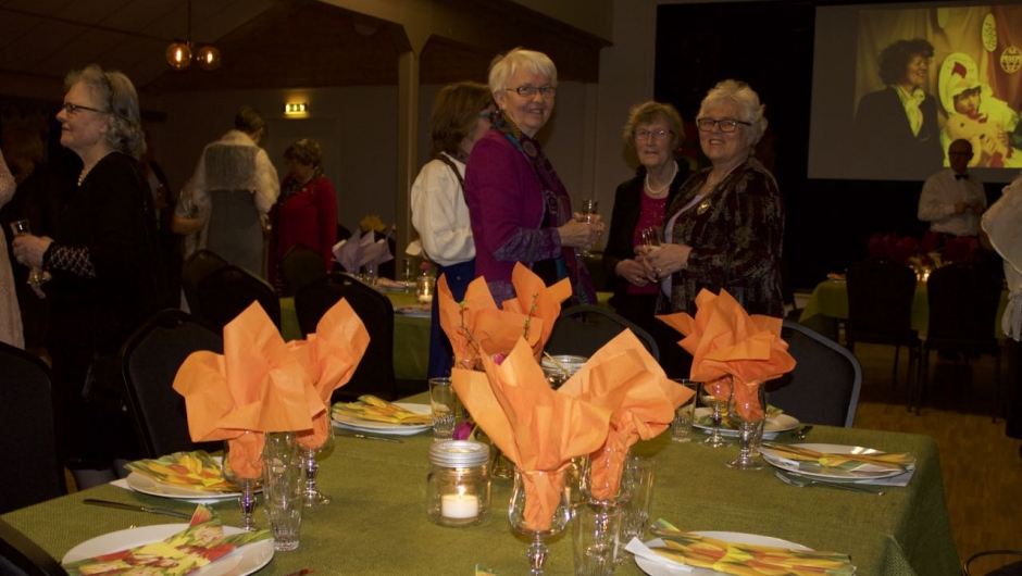 Tett snøfall ute, vår i vente inne. Tid for fest i laget, og det med friske farger, velkomsdrink, tapasbord, Kelnerkorpset, quiz, sang, taler og et bugnende dessert/kakebord. Skiftende fotografier projisert opp på lerretet på scenen fra lagets spede barndom og helt til 90-tallet. var innertier! Moro å se seg selv og hverandre for mange år siden - kommentarer og gjenkjennende nikk var det tett mellom.. Hillestad Kelnerkorps, (våre respektive ektefeller, eller, som det sto i en av sangene deres: "Hans Kristian med sin hær"), gjorde nå, som for 5 år siden, en fremragende jobb med servering av flytende og sang og gjøgling underveis.