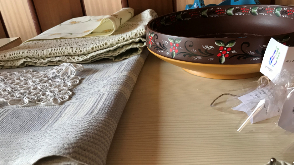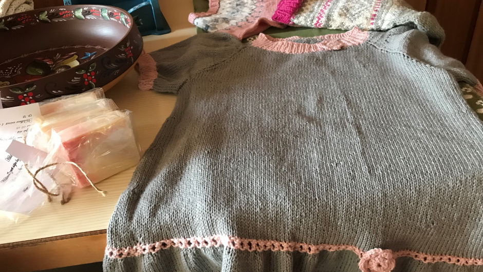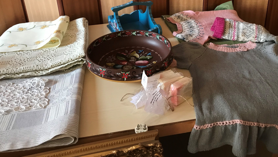 Torild Sønsthagen viste frem en barnejakke strikket i restegarn. Barnet hadde selv fortalt hvem i familien som hadde hatt strikkeplagg i de ulike fargene i jakka. Det var også fine lysestaker og bolle i treverk og en trerot som bar navnet Gubben. Et stort broderi av brudeferden i Hardanger som brakte frem mange gode broderistunder sammen med bestemor som i sypausene leste bok og de koste seg sammen.