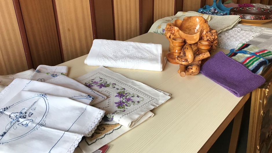 Solveig Bårnes som hadde en imponerende samling med broderte duker, kjøkkensett, hardangersøm og festforkle til vestfoldbunad. Solveig hadde brodert åtte festforkleer med sirlig søm. Det står det virkelig respekt av når hun broderer alt med en hånd.