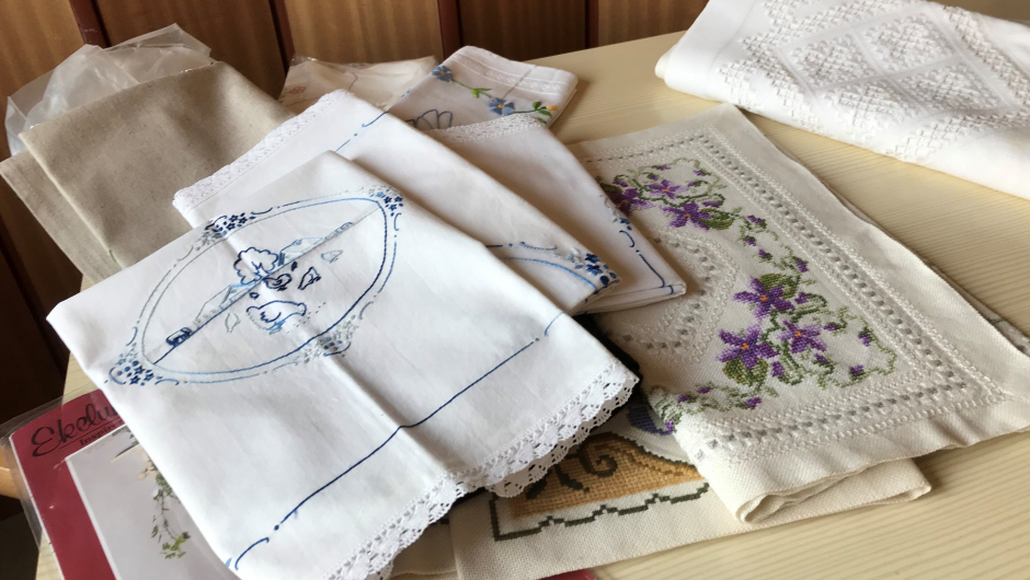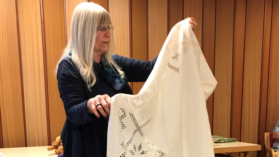 Elsa Ødegård viste frem en hvit duk brodert med mange ulike mønstre. Den hadde hun sydd da hun var sytten år gammel. Her var det brodert både med hvit og svart søm som gikk over og under stoffet i tynt, tynt brodergarn.