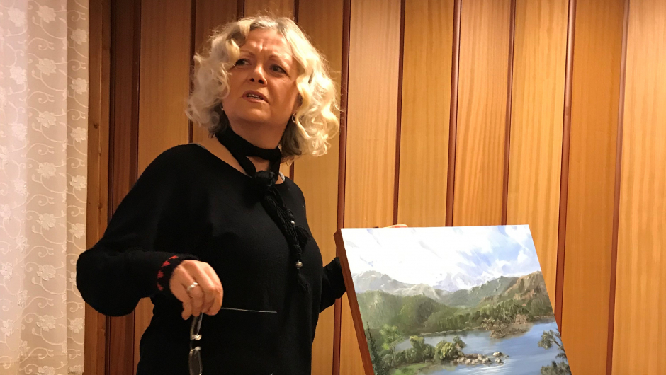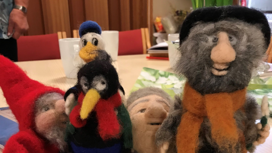 Jorunn Hogstad viste frem en flott rosemalt trebolle. Fint å se håndarbeide i annet materiale enn tekstil. Hun viste også frem en kjole hun hadde strikket til barnebarnet, det er en egen glede med å gi bort klær som ikke kan kjøpes i butikk, men med hver maske strikket med kjærlighet. Hun hadde også strikket tykke deilige sokker i mariusmønster. Tilslutt viste hun frem en stor grønn duk sydd i hardangersøm som hun hadde sydd da hun var ung. Det hørte med til historien at hun hadde fått klippet feil i mønsteret, men det var blitt stoppet. Nå hadde duken ligget i skuffen i mange år, men nå ville Jorunn finne anledninger til å få den frem. Duken fortjener å bli brukt og vist, da hvert enkelt sting forteller om mange timers arbeid.