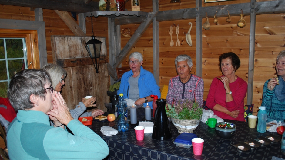Etter turen var vi inn til Kari Anne som har hytte på Hildalsstølen. Ho varta opp med eplekake og kaffe! Der gikk drøsen flittig før vi tok på heimveg.