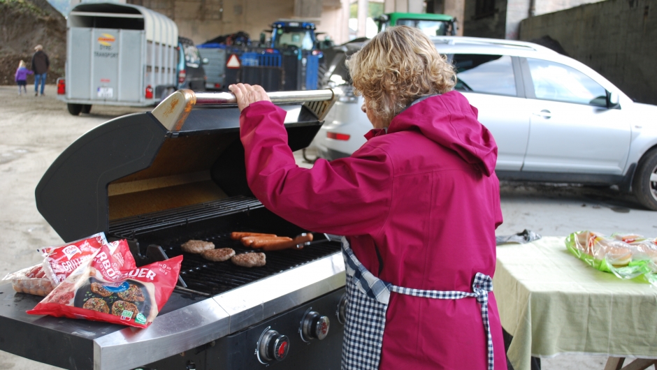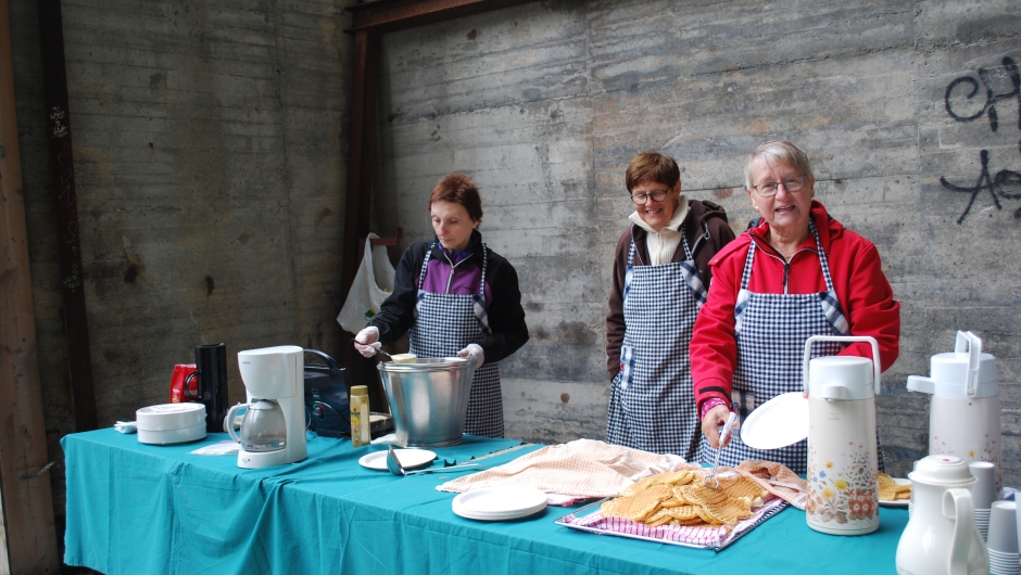 Me solgte nysteikte vafler og kaffi. Me grilla og pølser og karbonader som me solgte.