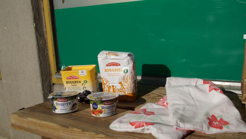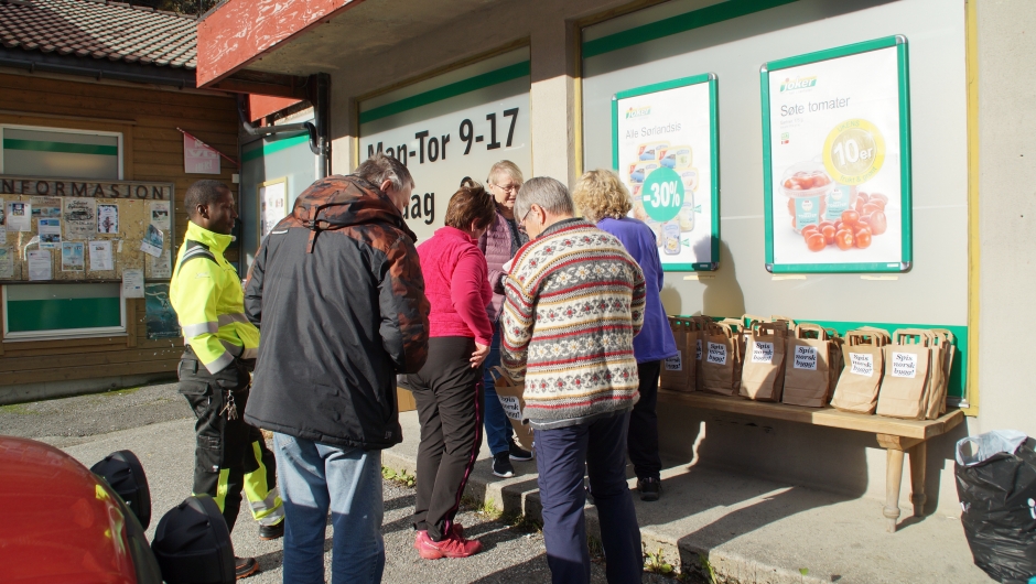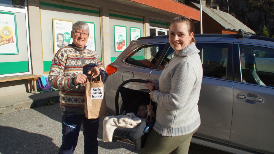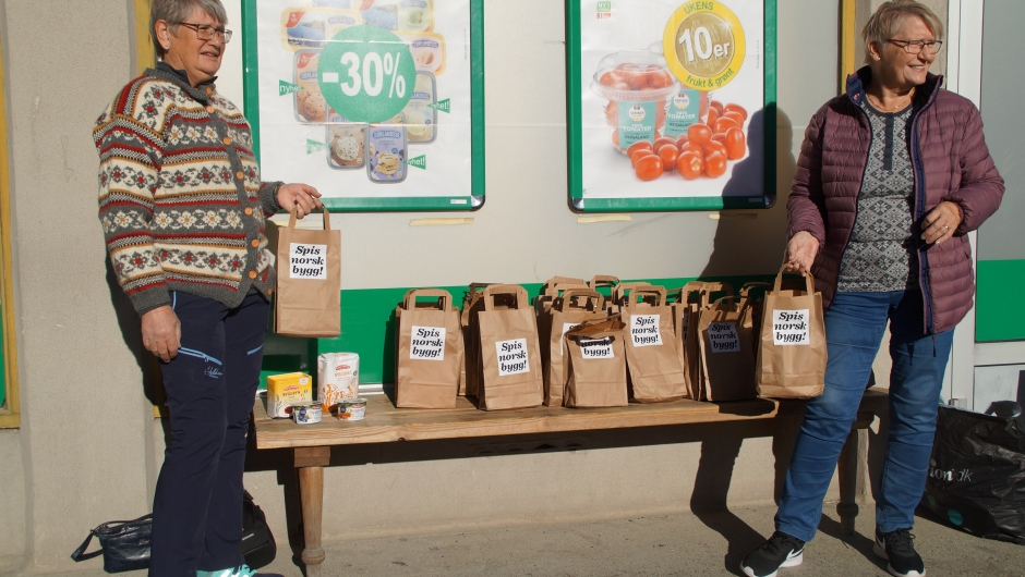 utenfor Joker i Skarsmo. Der delte vi ut 50 poser som innholdt Bygg-og havregrøt og middagsbygg levert av Coop. Et oppskrifthefte med gode oppskrifter fulgte også med.