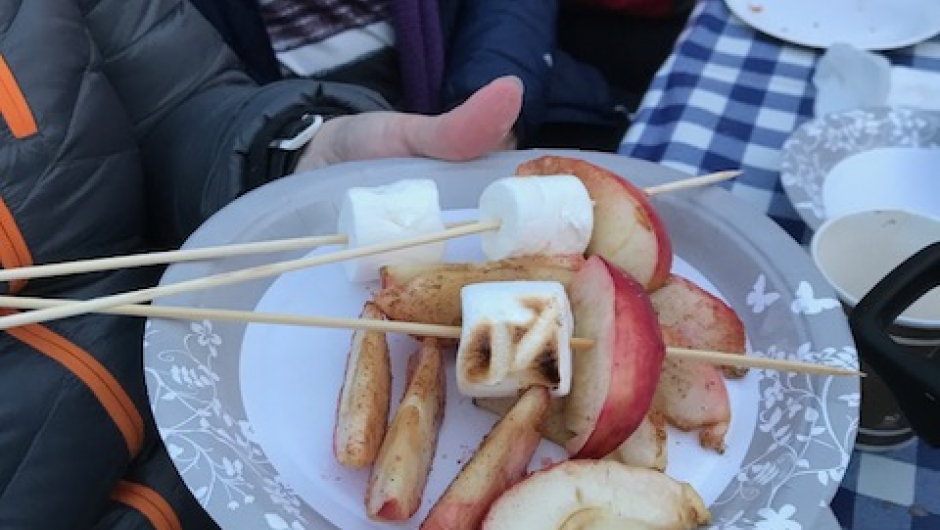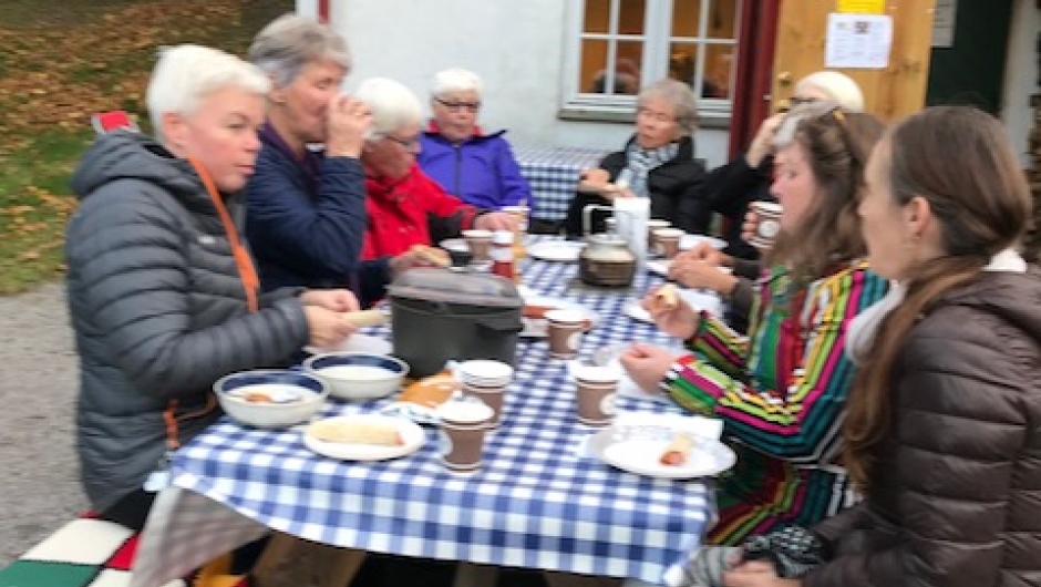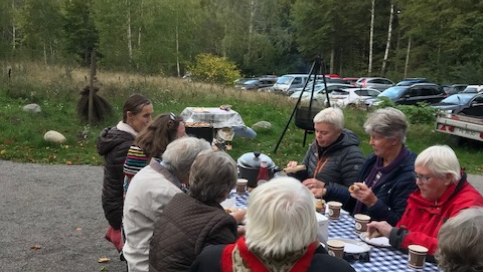 Vi ville ha med alle på tur, og gikk en liten runde på kulturstien over Kvellestadåsen rett ved Bryggerhuset der vi har møter. Etterpå grillet vi pølser og pinnebrød til hovedrett og epler med kanel og sukker samt marshmallows til dessert. Det ble en veldig hyggelig ettermiddag i et flott høstvær med veldig hyggelige damer.
