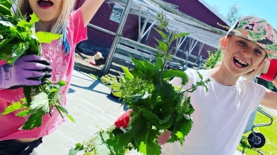 To ivrige jenter fra Spydeberg som deltok på kurset «Bærekraftig matkunnskap» i regi av Spydeberg Bygdekvinnelag. Her ble det høstet brennesle, lagd rabarbrasyltetøy og saft av geiterams. Målet var å inspirere barna i Spydeberg til å bruke mer av det som vokser rundt oss. Foto. Tina Berger.