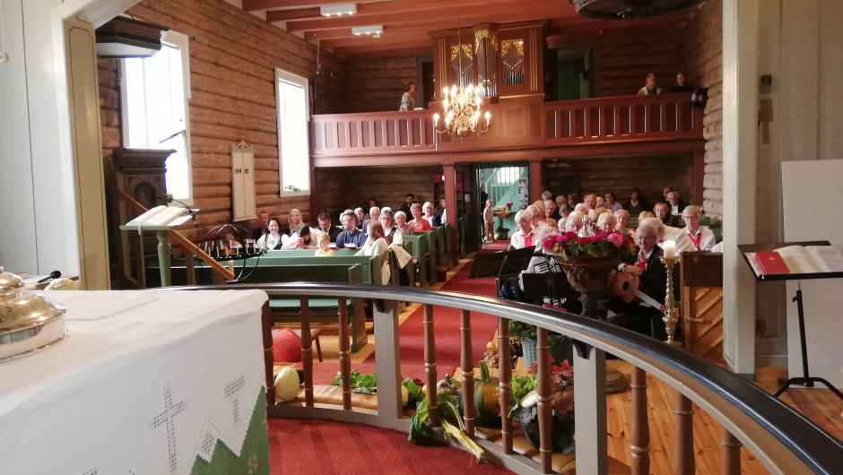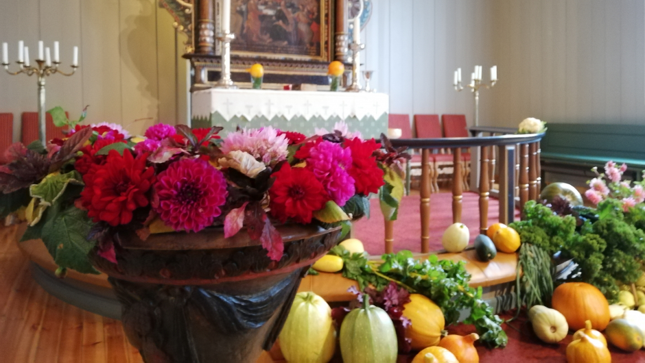 Kirken var frodig pyntet av bygdekvinnene, slik vi gjør hvert år.