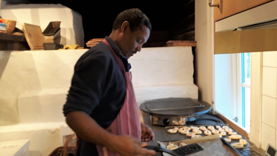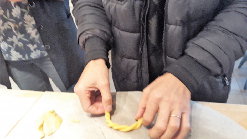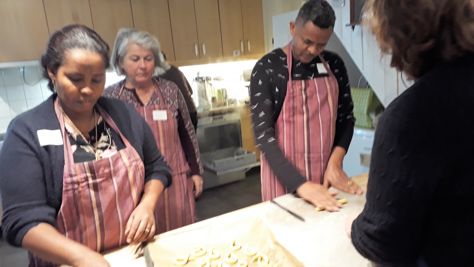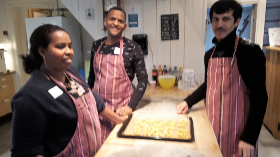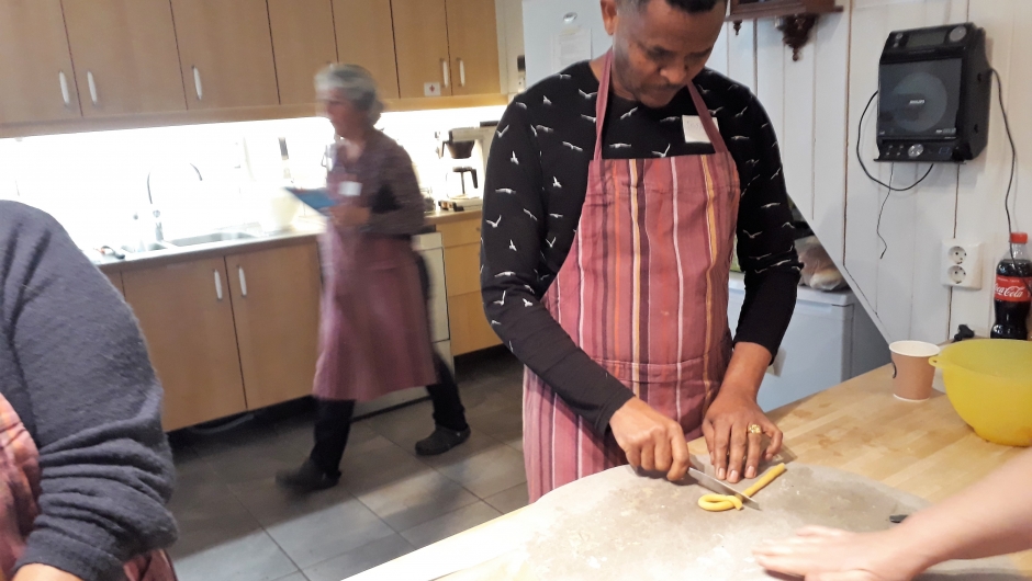 Deigen til Berlinerkransene var laget på forhånd, og utbakingen gikk som en lek. Ekstra kreativitet sto en av de mannlige deltakerne for, han introduserte en flettet utgave av kransene, som ble riktig fin når den ble stekt. Flere deltakere er fra Syria. Der er det ikke vanlig at menn baker, det er det kvinnene som gjør. En fortalte at dette var hans debut som baker. I tillegg til Berlinerkranser ble det også laget deig, og stekt kokosmakroner. Resultatet ble aldeles utmerket, og alle fikk med seg en en smak hjem.