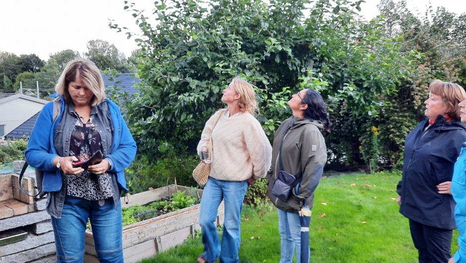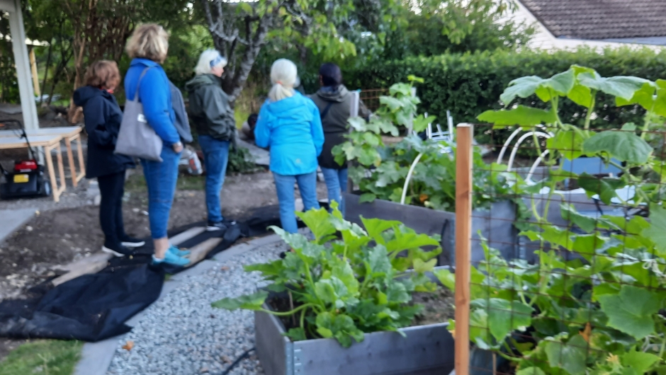 Etter omvisningen i hagen fikk vi en hyggelig kaffeprat innendørs. Da utvekslet vi erfaringer om oppbevaring av frø, at tomater når de blir modne og røde utskiller etylen, noe som bl.a. agurker er ømfintlig over. Det er vel og merke seg. Flere hadde erfart at det ikke ha vært så lett å få fatt i frø til de vanlige norske slangeagurkene - Det var også interesse for å dele kunnskap og lære med om fermentering og andre metoder for oppbevaring av grønnsaker. Det har vært varmt i sommer, og de som har små drivhus har erfart at temperaturen blir altfor høy for plantene. Unni kom med et tips, hvis en ikke ønsker å kalke vinduene, - skummet melk på sprayflaske - Et skikkelig kjerringråd!! Vi ble enige om å hoppe over møte i september, men tar et oppsummerende møte i oktober.