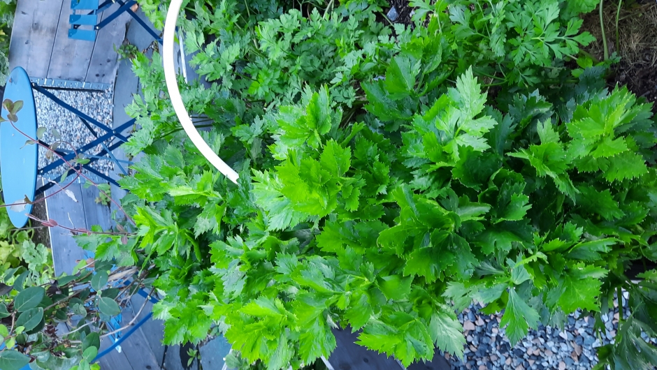 Så kom vi ned til kjøkkenhagen og pallekarmene. Her lar jeg Grethe overta selv: «3dje året med pallekarmer, det har vært bratt læring og veldig gøy. Startet friskt med alt jeg hadde lyst på. Siden har jeg blitt kjent med både skadedyr og rådyr. Kål ligger tynt an til neste år. Nabolagets rådyr elsker mine pallekarmer. I år tok de tomat! Det styrker meg i troa på at de tar alt bare det er smått nok! Samme med agurk og alt som er under 3 cm. Bladverket på stangselleri, persillerot og pastinakk har de hittil ikke rørt. Ikke månedsjordbærene heller. Bønner og erter slenger jeg et nett over.» (Elektroimportæren på Billingstadsletta har perfekte plastrør for himling over pallekarmer.)