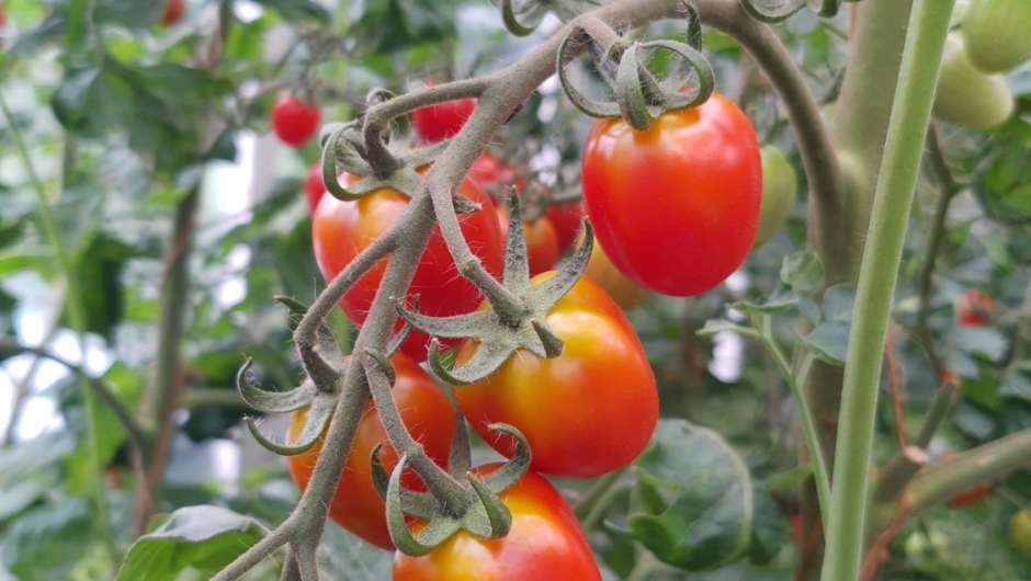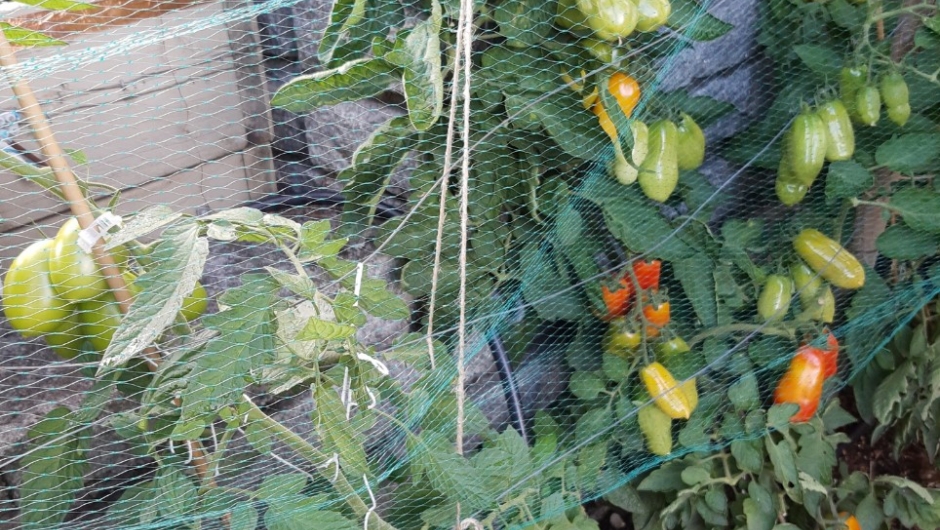 Lenger ned i hagen går vi forbi en vegg full av store fine avlange tomater . San Marzano, forteller Grethe, er en type plommetomater som blir 8 – 10 cm lange. Mye kjøtt, men ikke så søte, veldig gode til supper og sauser. De har en tendens til griffelråte, men det berges av eggeskall.
