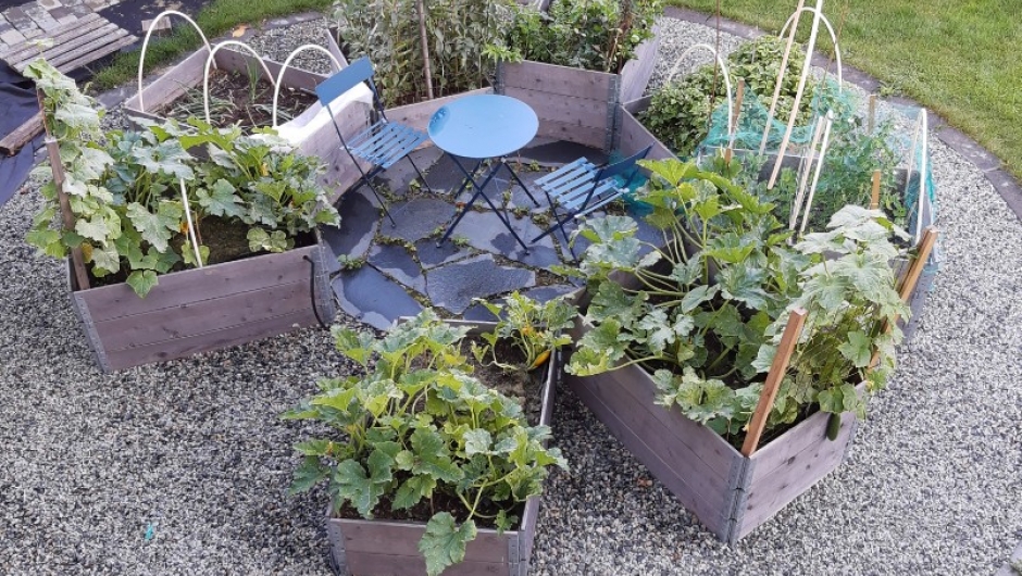 Fra terrassen hennes så vi ned på en spesiell, kjøkkenhage. Grethe forteller at det var barn og barnebarns tidligere fotballbane som hadde gjennomgått en stor forandring. 8 pallekarmer som nå var fulle av markens grøde, omkranser en liten koselig uteplass. Helt perfekt til å sitte og meditere over livet og ta en liten pause i hagearbeidet. Grethe forteller at arbeidet startet for tre år siden, og at hun har gjort alt selv. Imponerende. Pallene står på grus og rundt er det lagt stein
