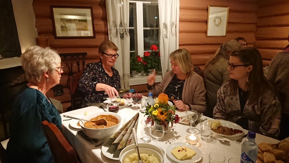 Etter årsmøtet gikk vi ned til 1etg. hvor festkomiteen hadde stelt i stand til festmiddag. De hadde gjort en fantastisk jobb og de stod på som helter, hele kvelden. Det ble servert en nydelig viltgryte, hjemmelaget potetstappe, salat og en deilig saus, sammen med godt drikke. Vi må ikke glemme den gode desserten, Tilslørte bondepiker!