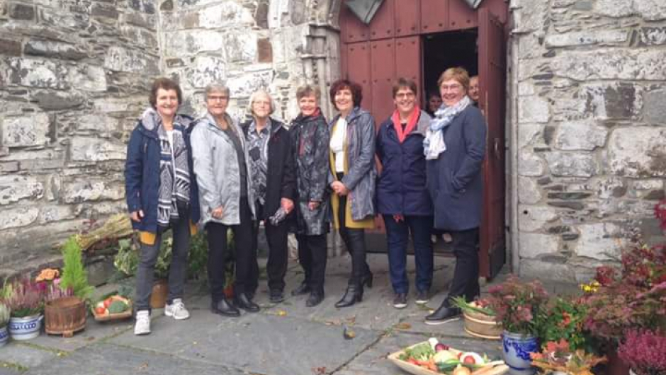 Tredje oppdraget til Bjørgum bygdekvinnelag denne helga, var pynting av Vangskyrja til hausttakkefest. Dette er noko me ikkje gjer kvart år. Det er stemningsfullt å pynte den flotte kyrkja vår i haustfargar. Så me sa ja, sjølv om det var ei travel helg for oss. Derfor forsette ein del av oss direkte frå Smalahovesleppet til kyrkjepynting. Veldig kjekt at sokneprest Kjersti Brakestad Boge var til stades under pyntinga. Ho kom med gode innspel om kvar det var lurt å plassera pynten, og ho skrytte mykje av alt det fine me hadde med. Når ni damer tar med litt pynt kvar, vert det mykje fint tilsaman. Dei fleste av oss tok turen til kyrkje dagen etter. Det var ei fin gudstjenesta med flott preik, dåp, nattverd og kyrkjekaffi til slutt.