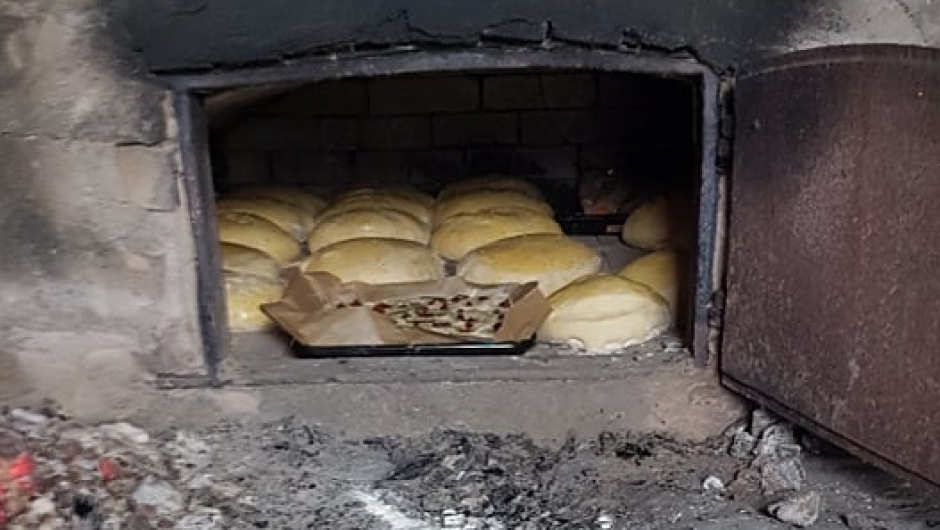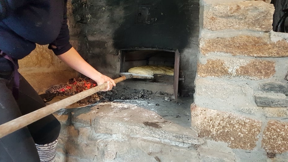 Ovnen er varm og brødet er ferdig hevet, nå er det å få baket det ut og la det heve litt til. Så skal det i ovnen. Det kan være en liten kunst å få lagt det inn, en skal jo få plass til mange brød og en kake. Med tungen rett i munnen blir alle brødene lagt varsomt inn i ovnen med en brødspaden. Dette skal bli godt.