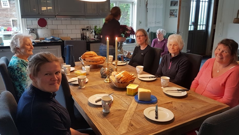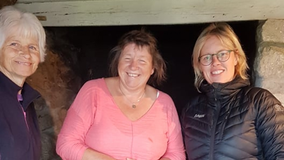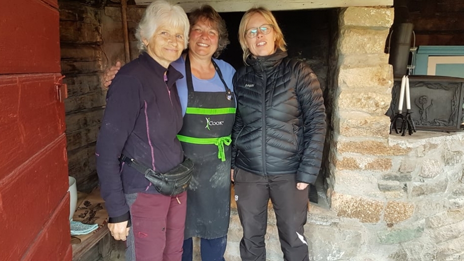 Det var syv glade damer som står klare på jønneberg for å bake brød i en steinovn, og Liv-Birgit Ulvenes står klar i døren på bakestua og ønsker de velkommen.