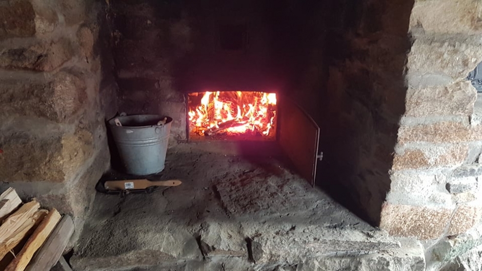 Det har nå vert fyr i ovenen i to timer og den er snart klar for å rense ut glødene og gjøre den klar til å bake brød. Deigen er blit laget samme dagen og står nå til første heving.