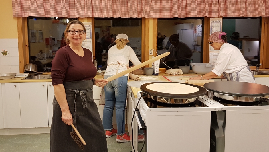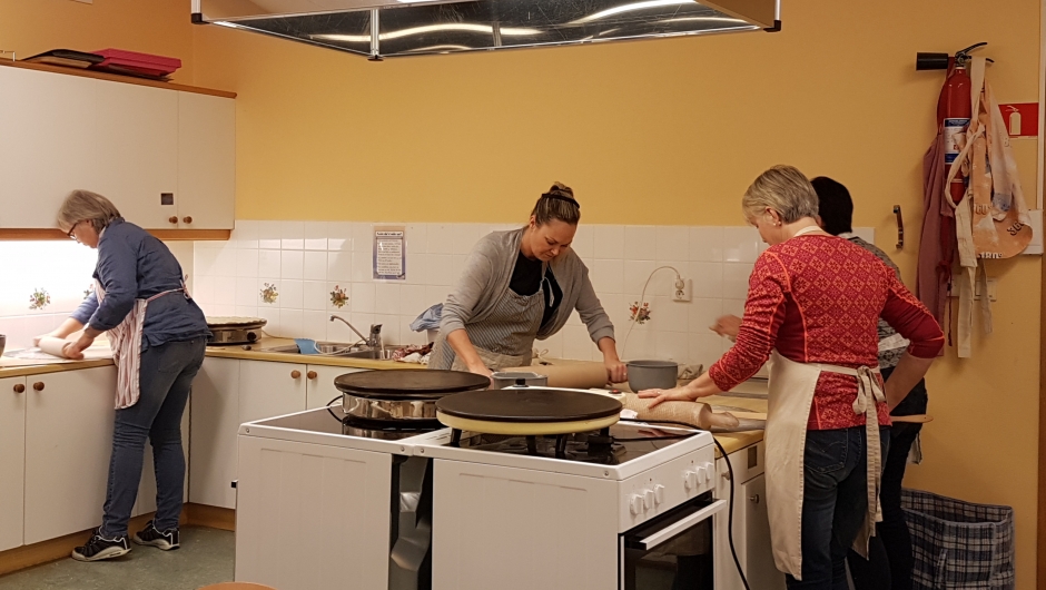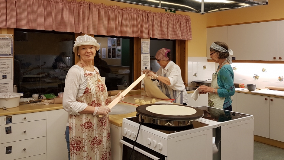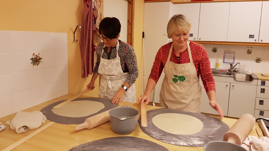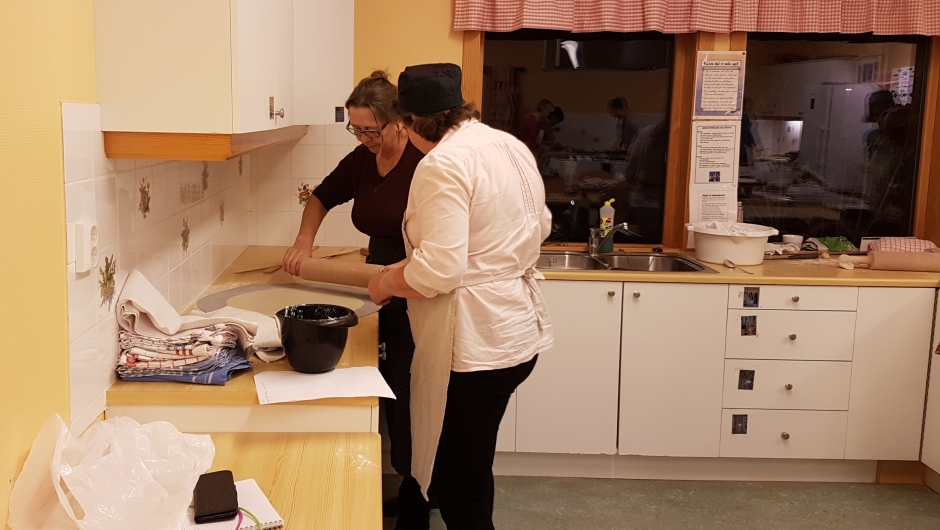 Det var stor bakeglede da åtte glade kvinner satte i gang bakstekurset, som nå har vart i tre dager. De startet med flatbrød og så var det klingen sin tur og til sist er det potetlefse. Rommet var fult av god lukt og stemning, og deres lærer Anne Grethe Hegnastykket gjekk fra plass til plass og fortalte hva de skulle gjøre og hvordan de skulle gjøre det.