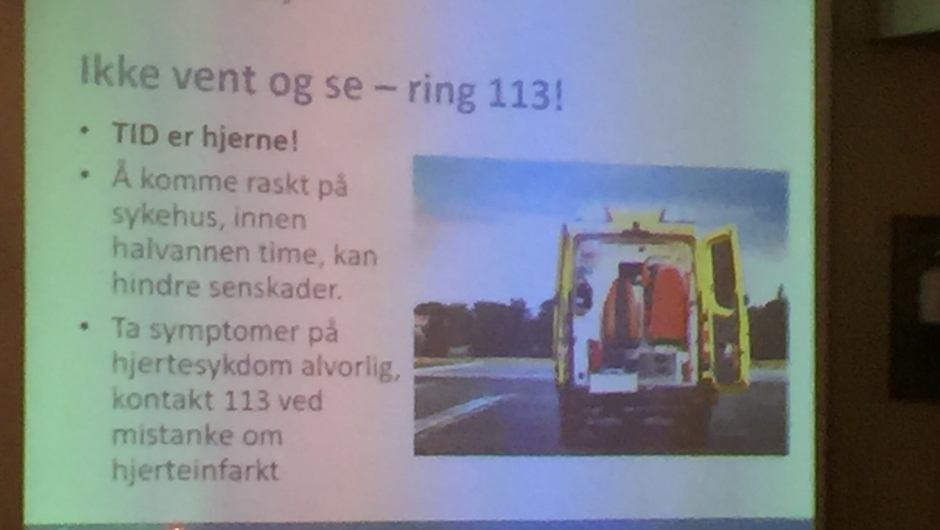 Hun tok spesielt for seg HJERTEINFARKT OG HJERNEINFARKT. I tillegg til snakke om temaet viste hun to videosnutter. Det var interessant å høre på henne, og noen fikk nok en påminnelse om at det er ikke dumt å ta en årlig sjekk hos legen.