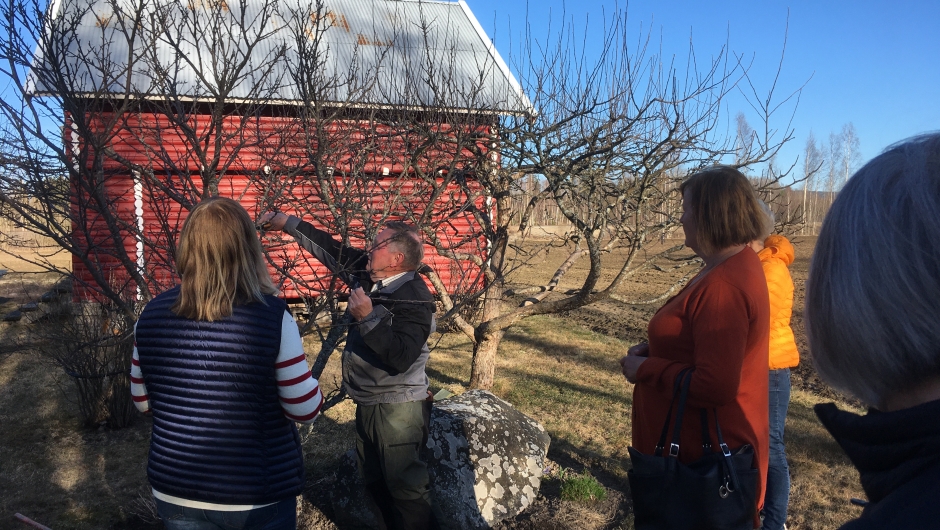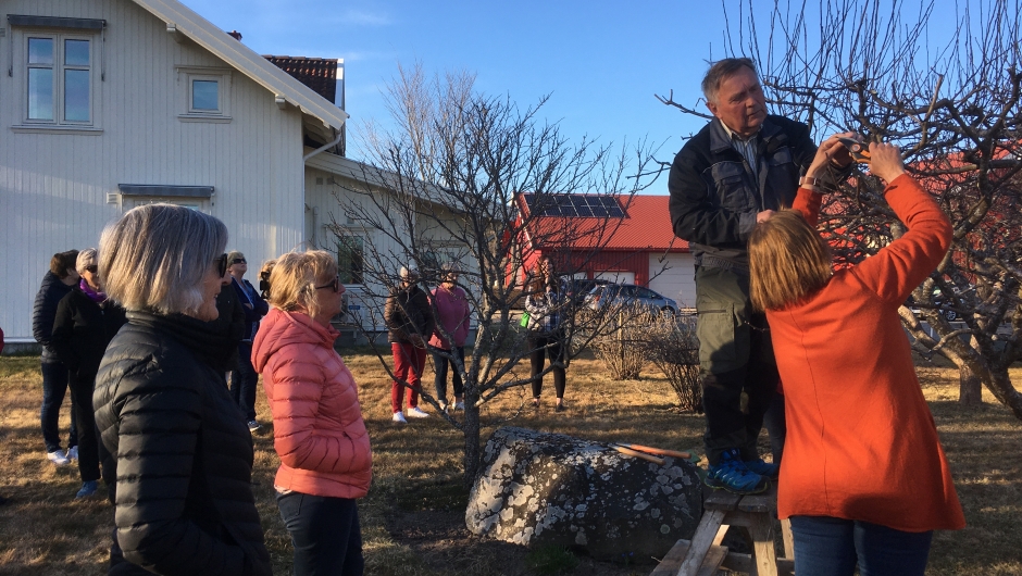 Vi ble ønsket velkommen til Helgeneseth. Stein startet med å vise oss forskjellige greinsakser og andre redskaper som han bruker til beskjæringen før vi gikk inn i hagen hvor det var solbær-, rips-, plomme- og epletrær. Vi fikk en grundig opplæring i hvordan de forskjellige trærne skulle beskjæres. Det kom mange spørsmål fra flere av de fremmøtte og de som ønsket det fikk prøve seg på beskjæring. Nå er vi klare for å ta grep i egne hager.