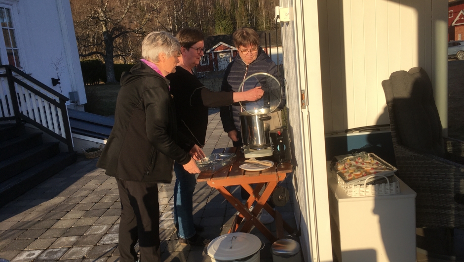 Etter beskjæringen forflyttet vi oss til utestua i Leppenga hvor Grete Morønning sto klar med varme wienerpølser med tilbehør og drikke. Det var godt med noe varmt da vi var litt kalde etter å ha stått ute. Det ble også servert muffins og kaffe.