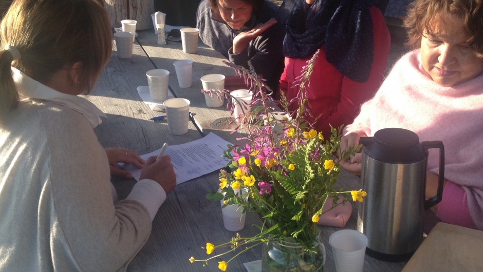 Grendekvinne, Grete Onsrud ønsket velkommen. Det var mange medlemmer som hadde tatt turen til Lysen denne kvelden. Det hadde også knotten, for etter litt regn på dagen, så hadde de våknet til liv. Myggspray/-stift og djungelolje ble flittig brukt, i tillegg til mygglys og myggfangere på bordene, men det la ingen demper på stemningen. Vi tok det med godt humør og praten gikk livlig mellom sang, quiz, info fra leder og loddsalg.