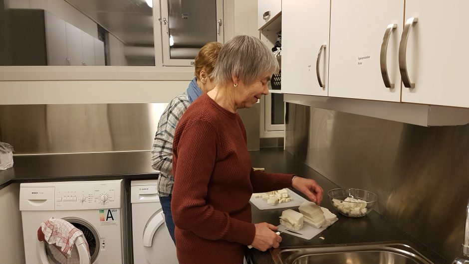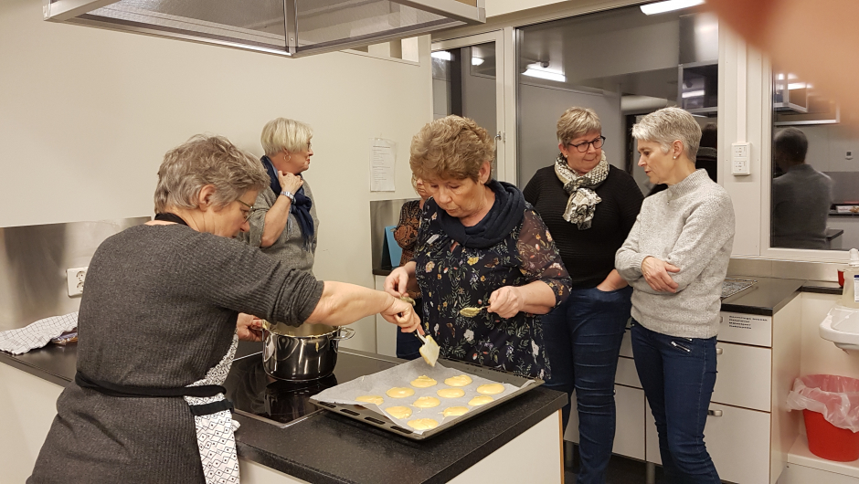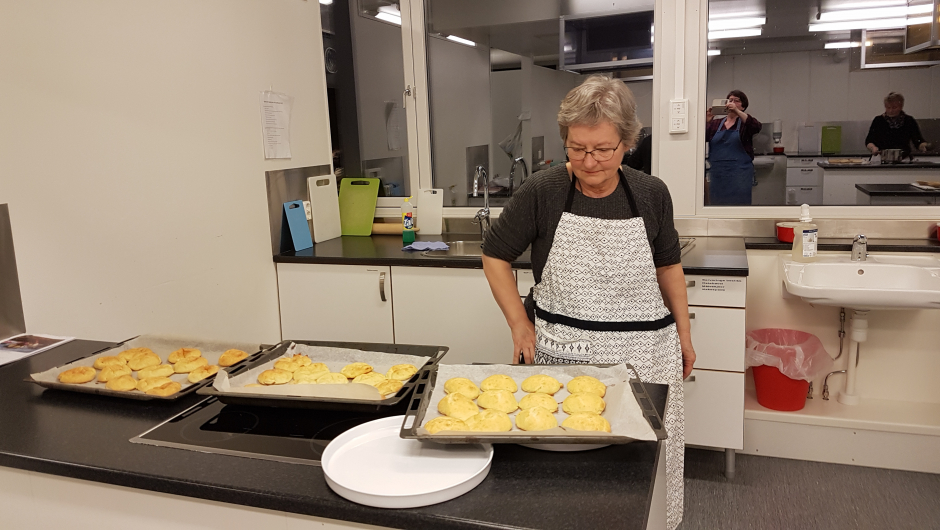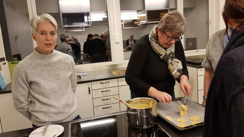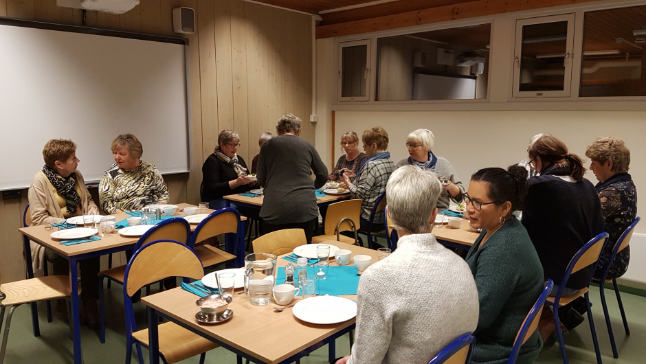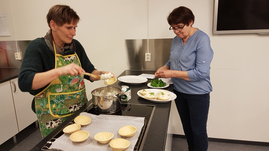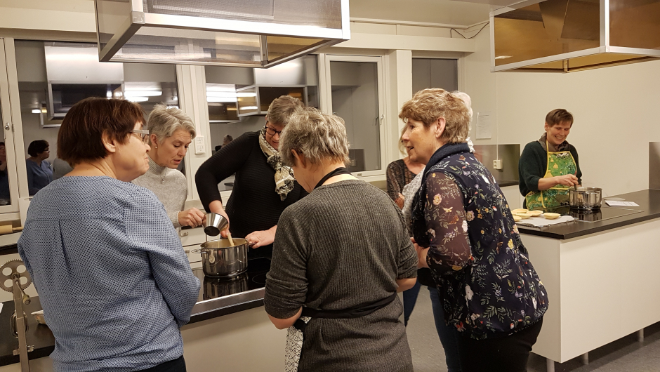 På planen for februarmøter stod «Tradisjonsmat/matkveld». Grend 3 var ansvarlig og hadde forberedt en enkel rett og kake: Fisk i terteskjell og vannbakkels.