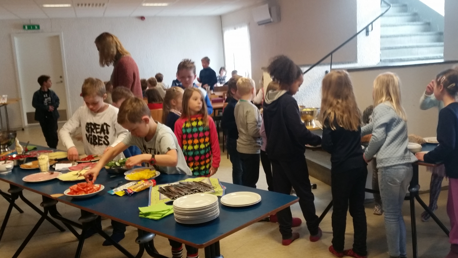 Elevene ble delt i tre grupper. den første gruppa startet kl 10.30, gruppe 2 kl.11.00 og siste gruppe kl.11.30. Det var mange spente og sultne barn som kom i følge med voksne.Tove ønsket velkommen og fortalte dem om hva de fikk og spise. Alle forsynte seg godt og stemningen var veldig god. Tilbakemeldingene var gode og de håpet at dette kunne bli gjort igjen. Som noen elever sa : "maten var kjempegod, hvorfor kan vi ikke ha kantine på skolen" Glade,mette og fornøyde gikk de tilbake til skolen for å fortsette skoledagen.Damene fra bygdekvinnelaget sto igjen og følte at de hadde hadde gitt barna og de voksne en positiv og god opplevelse.