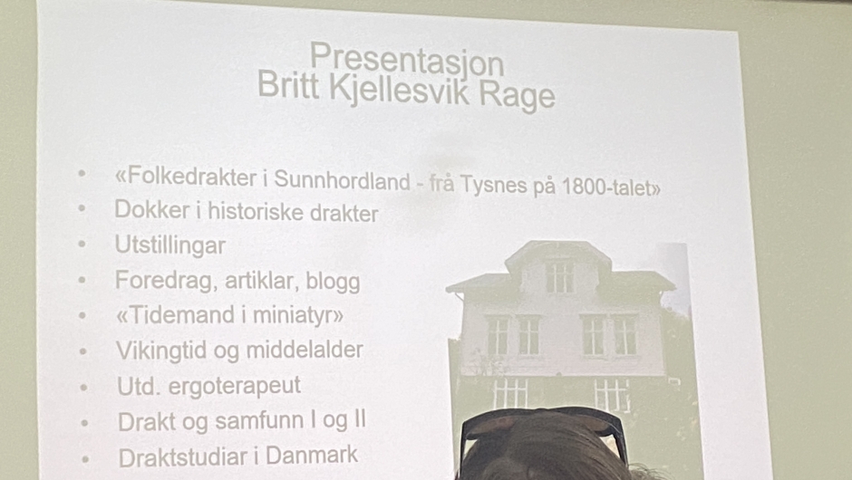 Britt Kjellesvik Rage som er tekstilkunstnar, var der og fortalte om dokkene sine som ho syr klær på,og som ho lager heilt frå bunn, Kroppen blir til av papir,ho syr drakter som er utrulig vakre, og det er veldig smått det ho sit og syr og lager til.Var utrulig interesant å sjå det ho hadde laga, med litt hjelp av mannen sin også, Knut Rage. Denne utstillingen ho hadde med seg var frå Adolf Tidemanns tid.