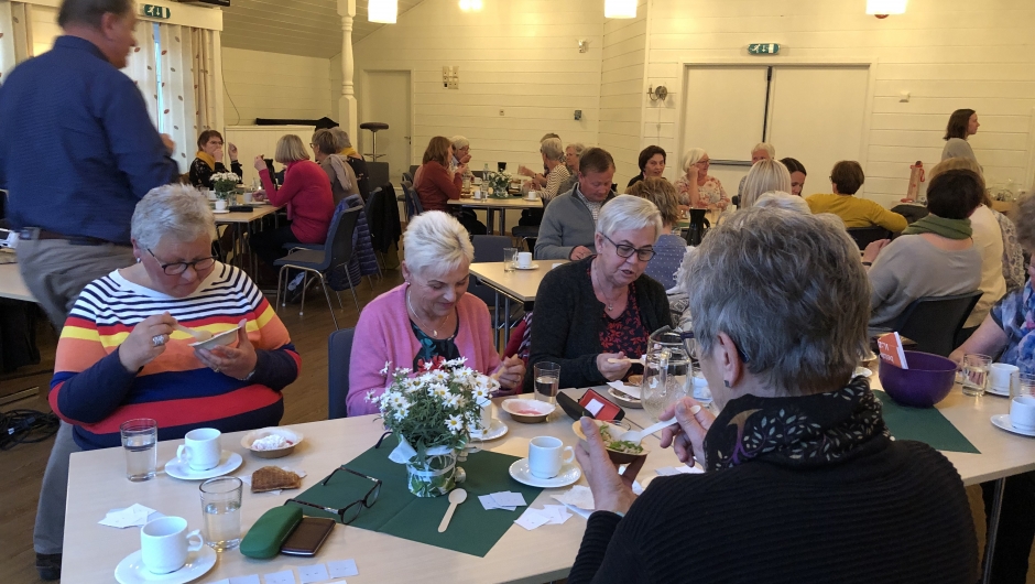 Dette var utruligt interesant. Men fekk smaksprøver på forskjellige byggretter, Kaffi og gode kaker. Me finn mange gode oppskrifter om bygg på Trines Matblogg.