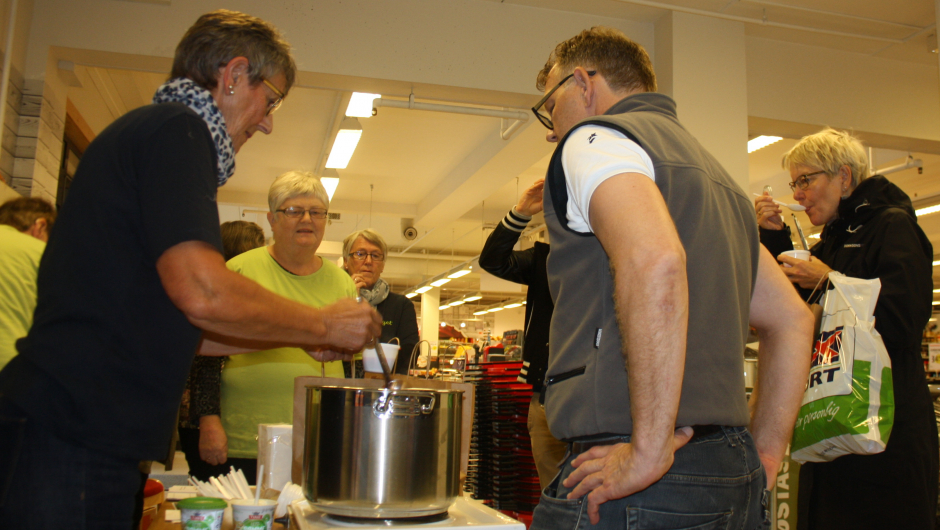 Idag er verdas Matvaredag. Me i Fitjar Bygdekvinnelag har laga grønnsaksuppe av norske rotgrønnsaker. Me har stått hos Larsen på Fitjar og delt ut smaksprøver . Me delte og ut poser med rotgrønnsaker og oppskrift på suppa. Desverre hadde me ikkje nok poser med rotgrønnsaker til alle .Suppa vart veldig god mange kom og smakte på den Ordføraren vår Wenche Tislevoll kom og å smakte på den, ho syns den var veldig god, den ville ho annbefale til andre ,sa ho. Mottoet er et meir norske grønnsaker.