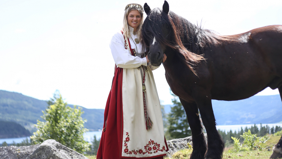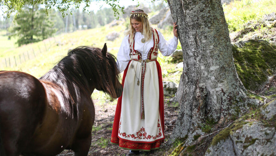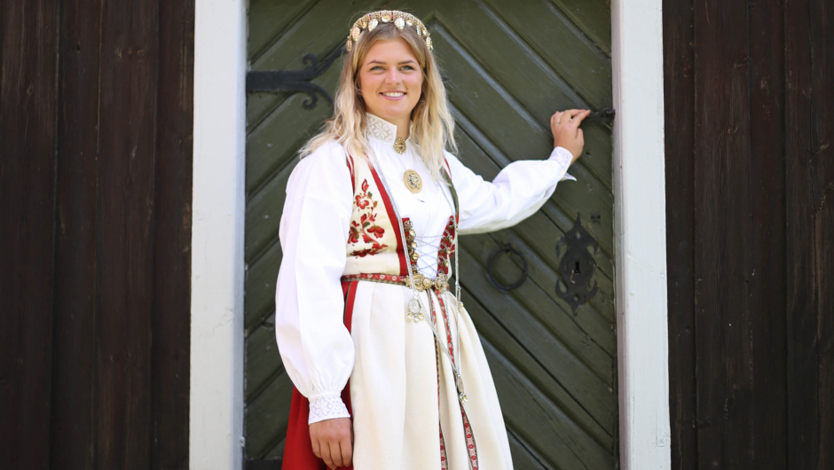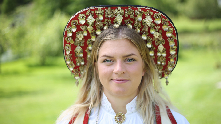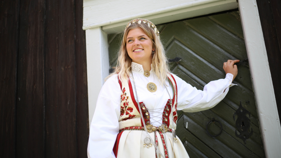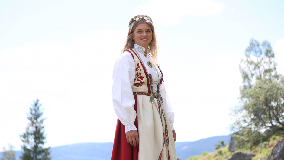 Bunaden har raud stakk, kvitt liv og kvitt forklede. Det høyrer og med sylv og ein malrull som hovudpryd, alt dette ser de på bilda.