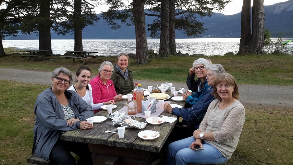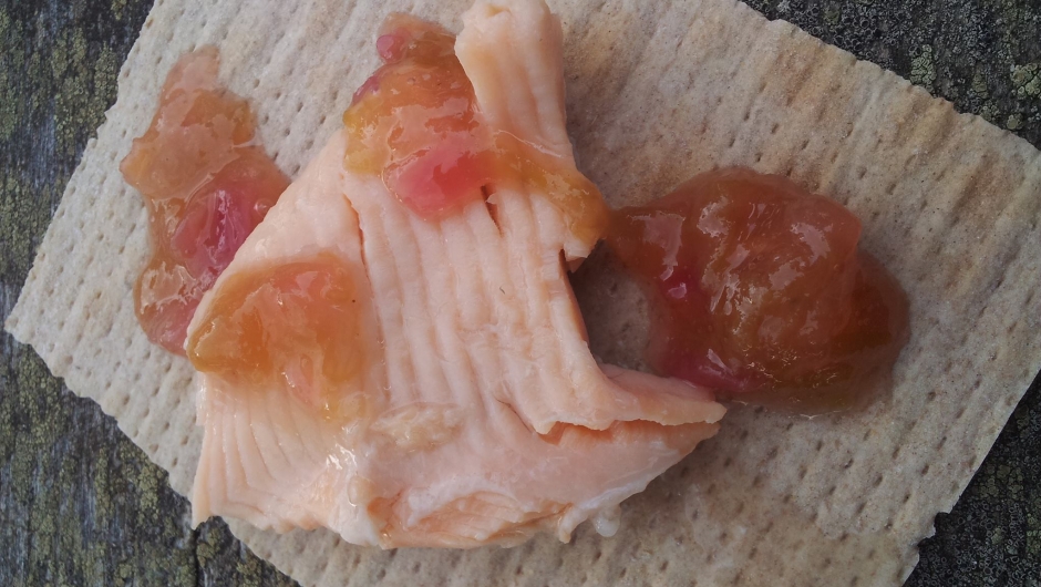 Etter turen samla vi oss ved grillen ved brygga. Grilla nydeleg fisk frå Telemarkrøye, Ingebjørg Aketun lærte oss ein enkel og rask måte å grille fisk på. Røya blei servert med brau og rabarbra- og ingefærchutney. Til dessert var det rabarbrakake og til drikke hadde vi rabarbrasaft.