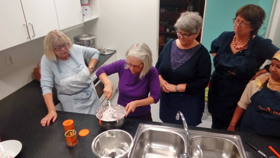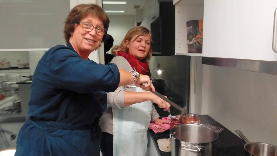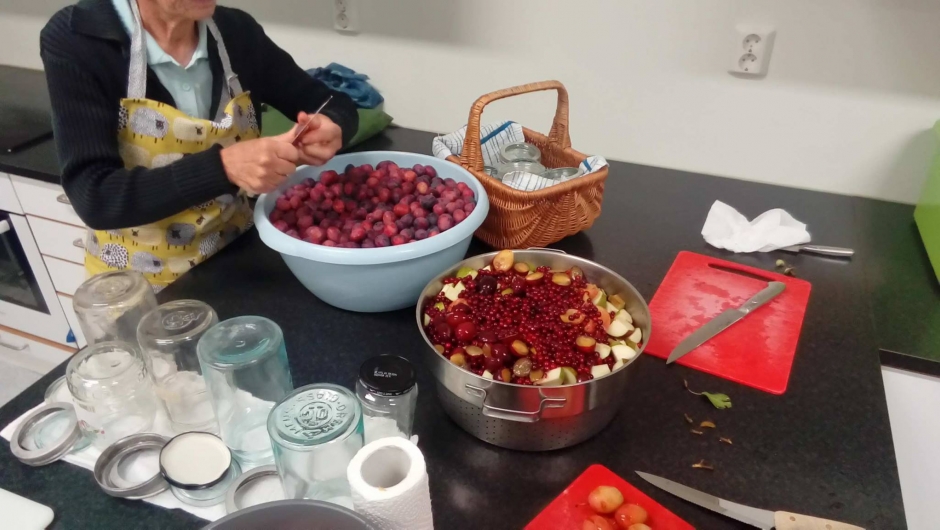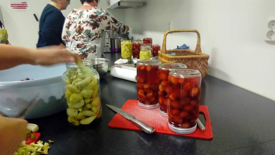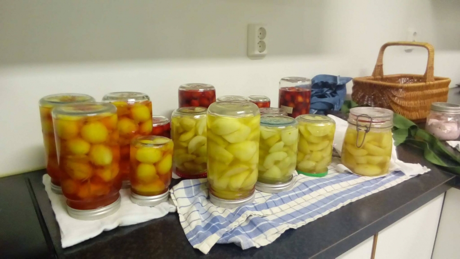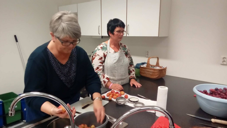 Vi laga ei nydeleg blandingssaft i saftkokaren, ein enkel is av krem og frosne bær, og fekk demonstrera korleis vi kunne lage "konfekt" av gamalt syltetøy m.m. Og så hermetiserte vi plommer og pærer i store mengder.