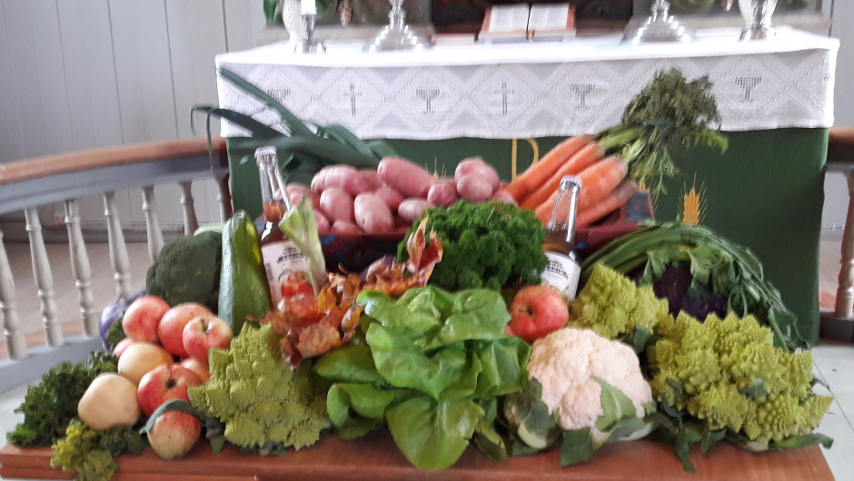 Bygdekvinnelaget hadde pyntet kirken med høstens grøde, et vakkert bord fylt av grønnsaker og frukt.