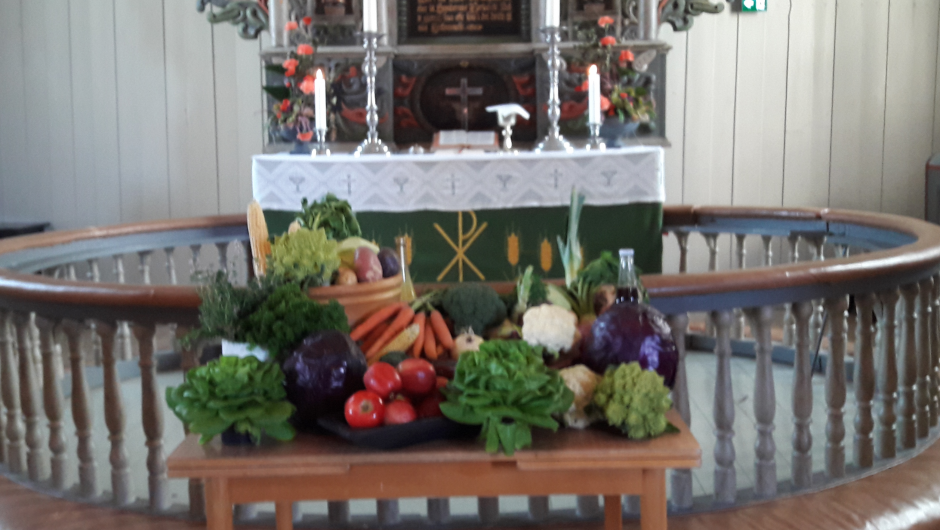 Bygdekvinnelaget hadde pyntet fint med nypegrener ved inngangen og med høstens grønnsaker og frukt foran alterringen.