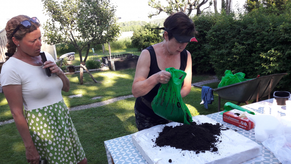 Før kursstart fikk de sju deltakerne en rask omvisning i den rikholdige hagen. Anne Karin fortalte blant annet om sitt jordforbedringsarbeid. Poteter er gode til jordforbedring. Hagen inneholdt mange forskjellige trær og planter, bl.a. et trollhassel-tre, og et Victoria-plommetre som var plantet i år. I hagen var det flere eksempler på betongstøpte former og heller.