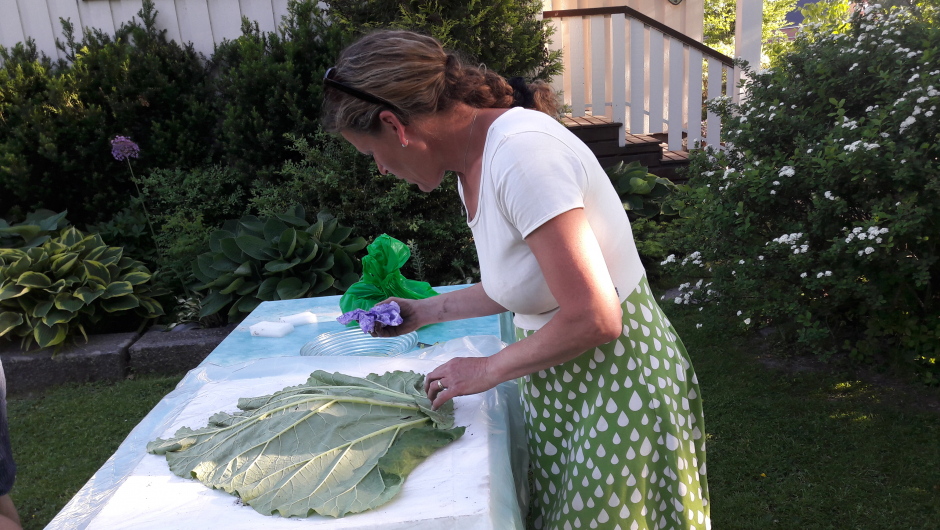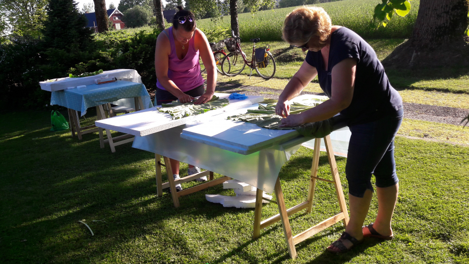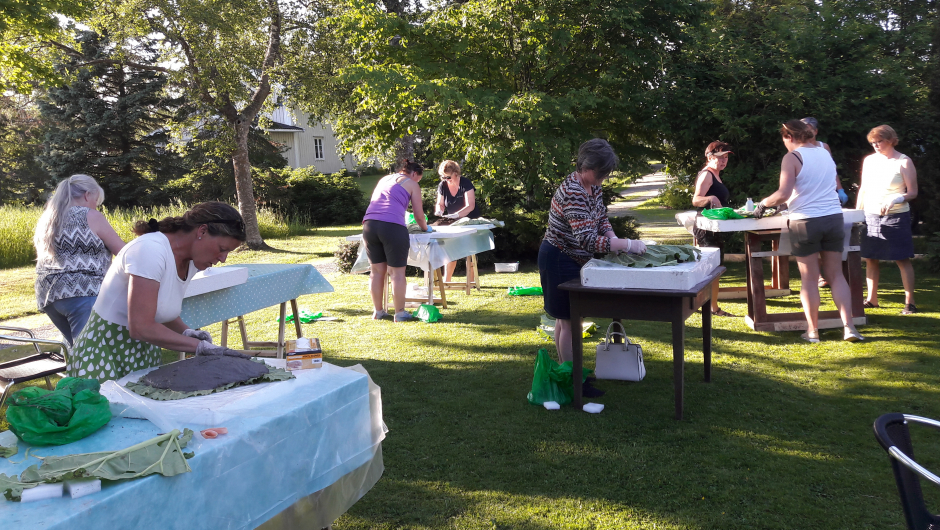 Ellen Grethe Haga var kursleder. Etter hennes innledning om fremgangsmåte og muligheter, valgte alle deltakerne å lage et fuglebad/blomsterkar med mønster av et rabarbrablad. Arbeidet startet med innpakking av jord, som rabarbrabladet ble lagt over. Rabarbrabladet ble smurt med rapsolje. Til slutt ble mørtel blandet med riktig mengde vann formet over. Formene måtte så settes til tørking i to døgn.