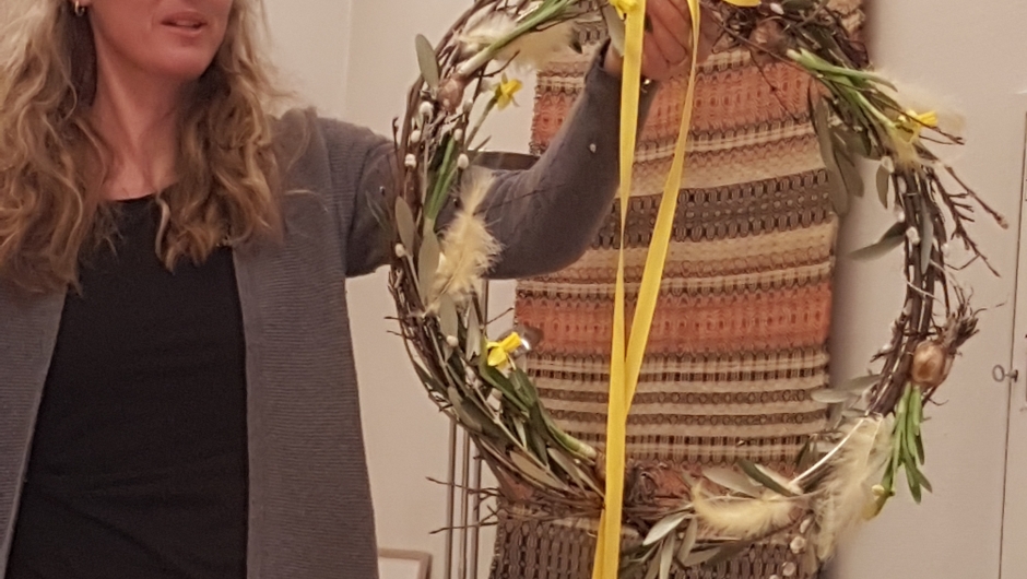 Une Bergan-Haavik fra Blomsterhuset i Hof delte ut en katalog til inspirasjon og viste oss hvordan vi med enkle midler kan lage krans og dekorasjon nå, med påske like om hjørnet. Løkblomster og puselabber pyntet bjørkekransen hun hadde med og potter med ulike løkblomster ble pyntet og loddet ut til heldige vinnere senere. I et større fat bygde hun opp en lekker påskedekorasjon, den ble solgt på auksjon etter utlodningen. Fint ble det og ikke vanskelig å få til, i en eller annen variant kan vi også klare det etter litt inspirasjon og tips om teknikker. Med utdelt rabattkupong ble noen og enhver fristet til å komme til butikken hennes, også utenom åpningstid, ved betaling med Vipps. Hun fikk matbok og drikkebok som takk.