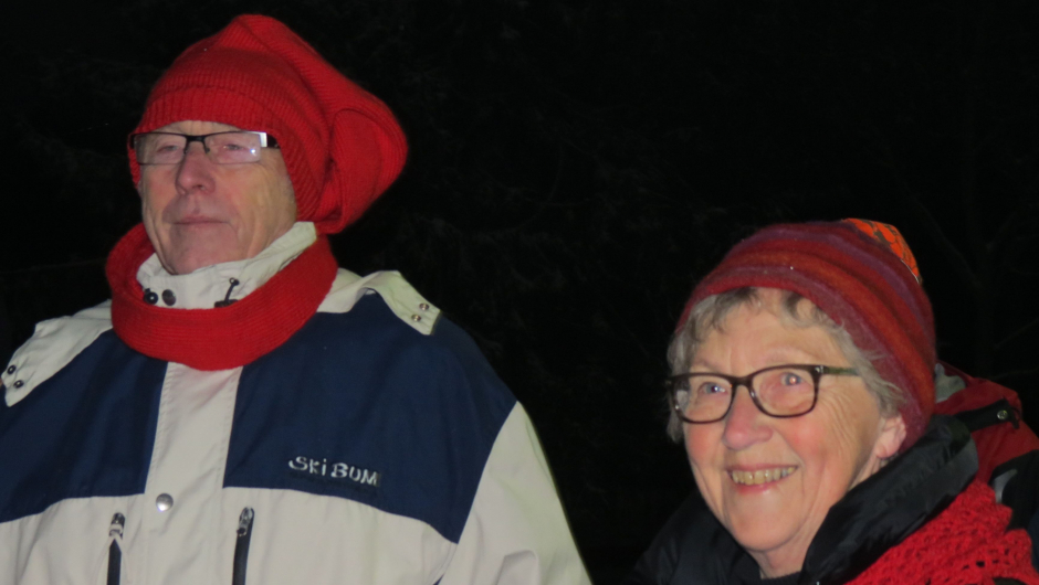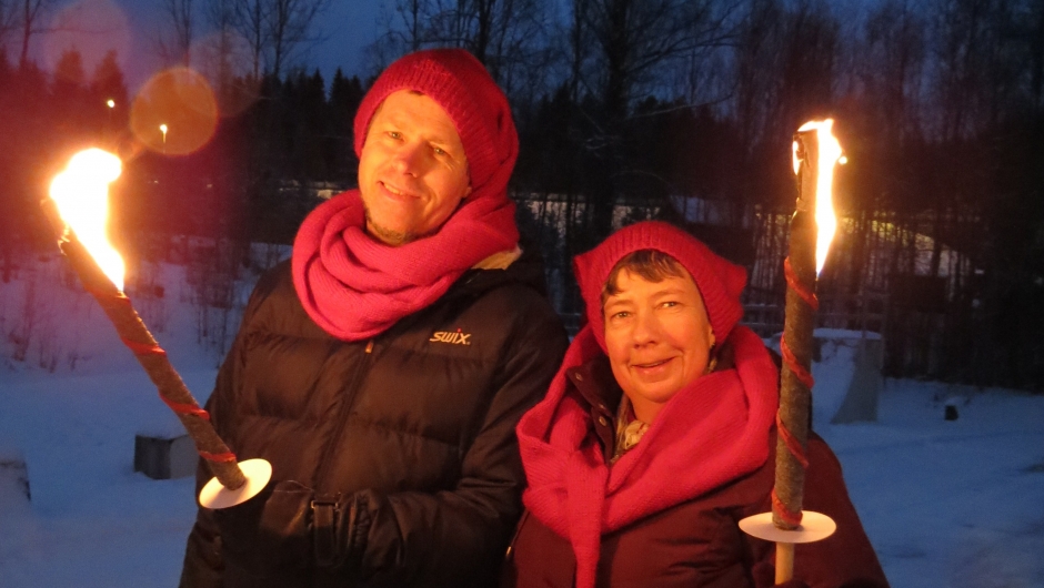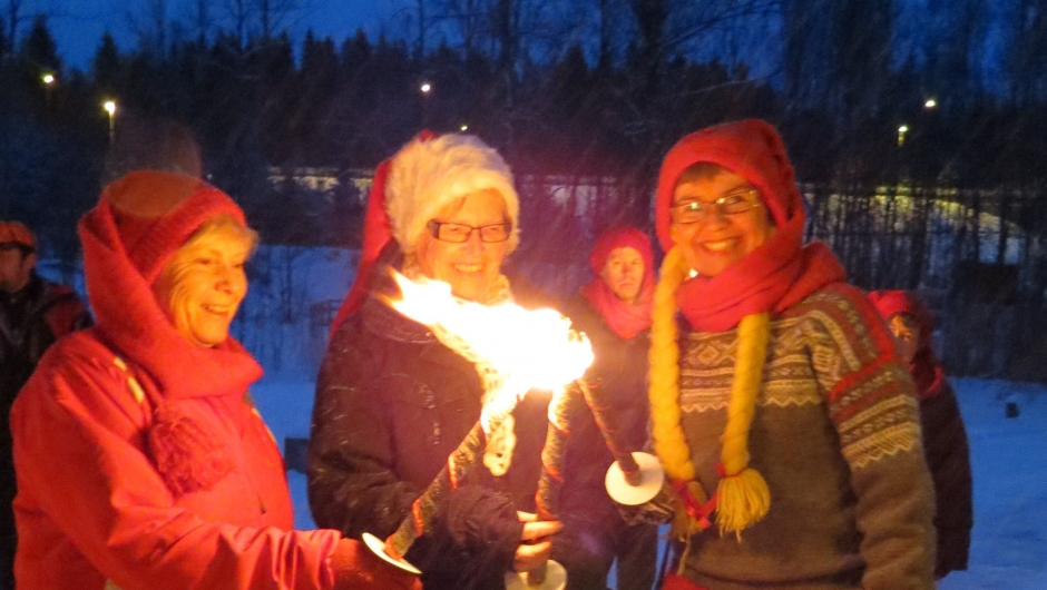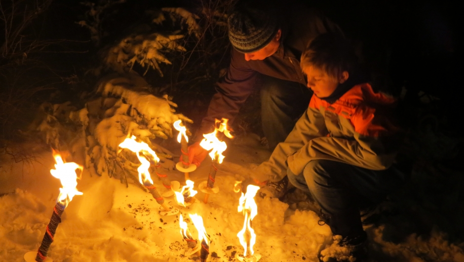 Et tog med fakler og røde luer snor seg gjennom skogen med snøtunge graner