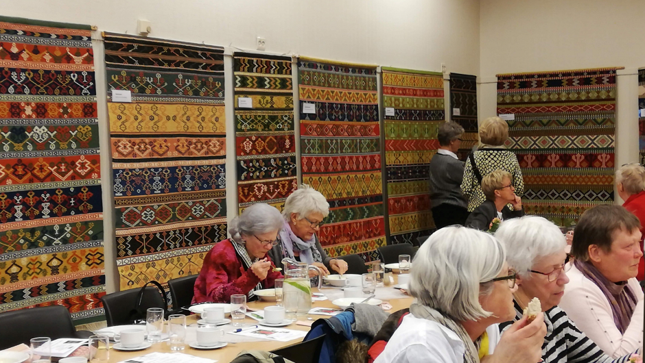 Og Bygdehuset Fjellhall var fullsatt av vevinteresserte. Kommet for å høre om Vestfoldteppene og om Vestfoldsmett som vevteknikk. Et arrangement som Nettverk Vev Vestfold og Holmestrand Husflidslag sto for.