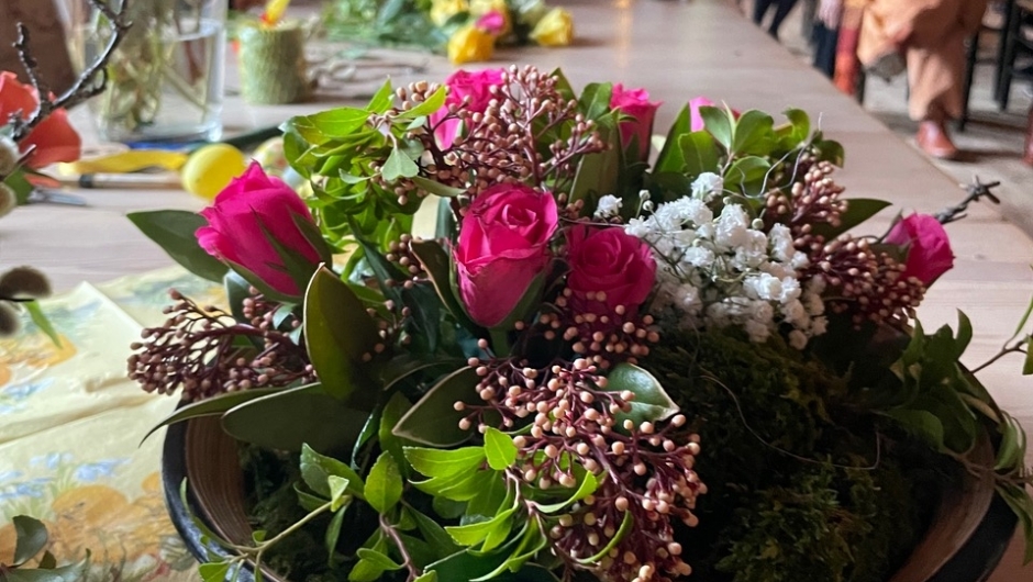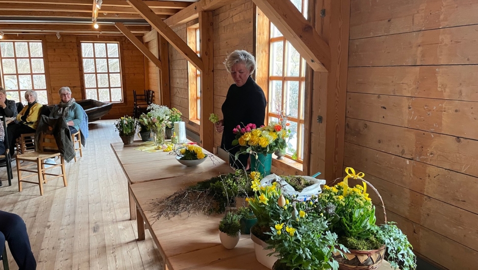 Liv Vadla Hausken hadde samla med seg sjølvhenta planter og kvister fra naturen, fra hagen, og fra blomsterbutikken, i tillegg til korger og skåler, påskekyllinger og egg.