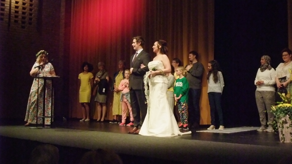 Mannekengene og Solbjørg mottok blomster for « jobben» de hadde gjort.