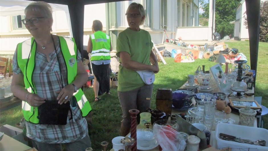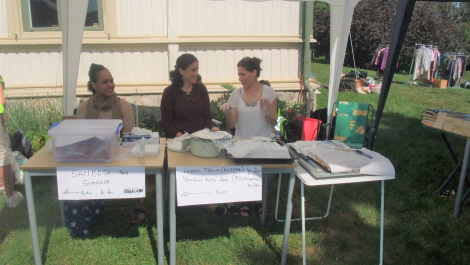 Vi hadde med oss fire damer fra asylmottaket på Dagsrud. To var fra Somalia, de hadde laget Sambuso en slags pirog med kjøtt- og grønnsakfyll. Dette var populært og ble nesten utsolgt. Resten kjøpte medlemmer av laget. De kurdiske damene hadde laget en slags tykk lefse/pannekake med tomat og litt annet oppå + tzatziki, dette var også populært. De hadde også med kake «Verdens beste» bakt av ei dame fra Fillipinene. Det var dessverre litt for varmt til å spise kremkake . Vi hadde satt opp et telt mellom matteltet og loppemarkedet, og vi pratet sammen så godt vi kunne og hadde det trivelig til tross for varmen. De var veldig hyggelige. En av damene som hadde ramadan, og det var ille i varmen uten å drikke. Absolutt vellykket «integrering». Det var en av de kurdiske som ønsket seg veldig ei takke for hun laget slike store flate brød og synes den takka vi brukte til sveler så grei ut, men hun hadde ikke penger til å kjøpe en ny. Det må være en oppgave for oss i laget å få tak i en pent brukt takke til en rimelig penge.