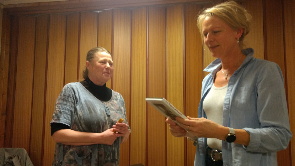 Kirsten takket Solfrid og overrakte gaven; boka “Fra Vestfolds spiskammer”. “Du fikk vårs te å tenke sjæl”, sa Kirsten, som sant var.