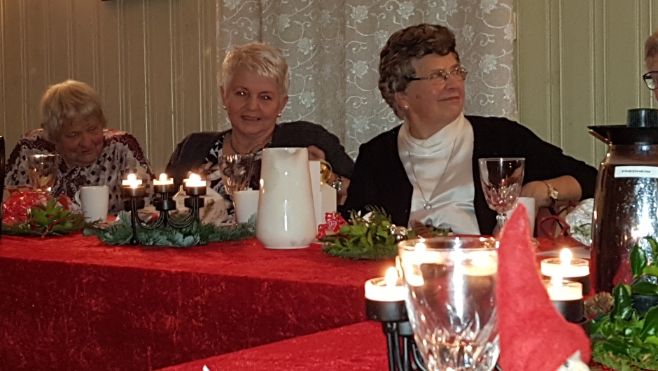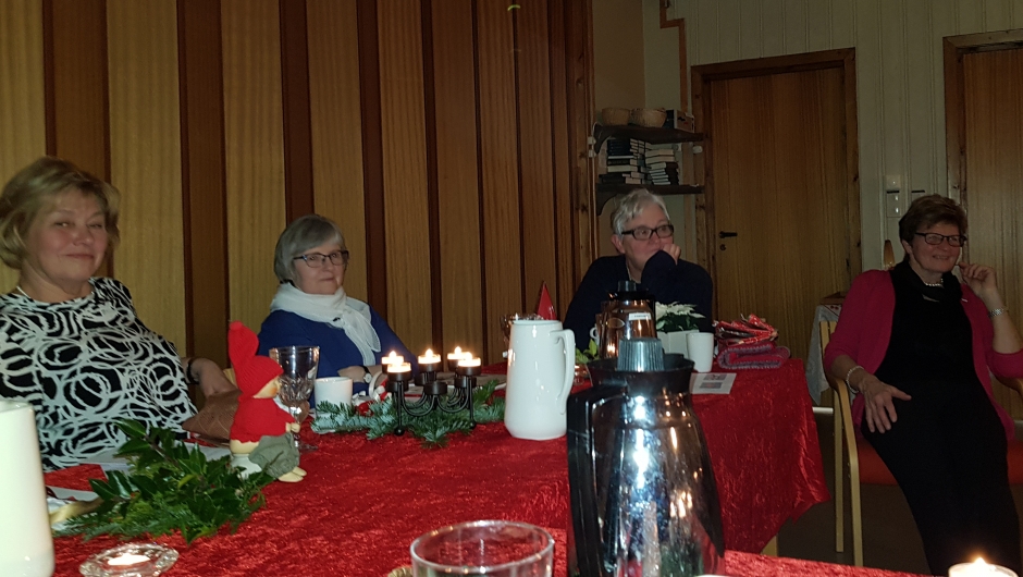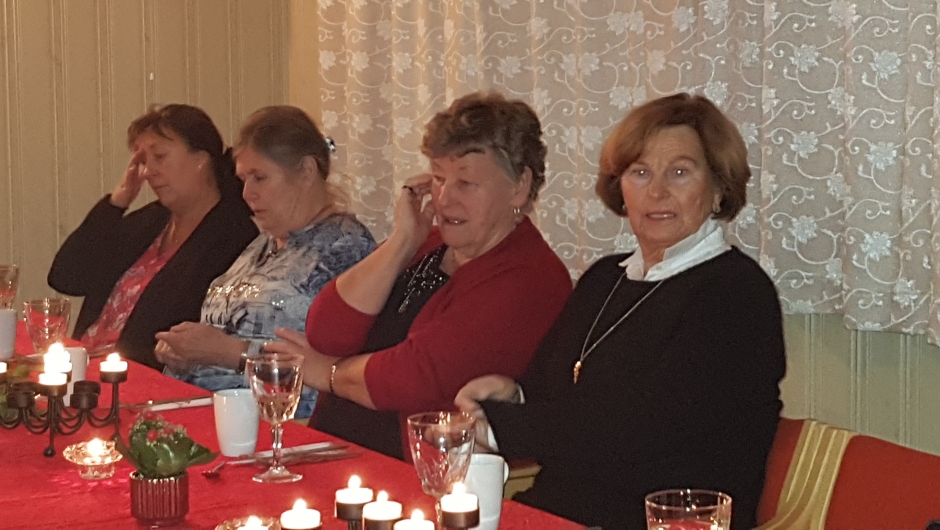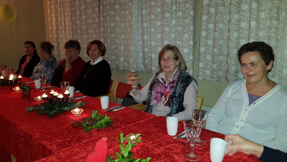 Første mandag i desember samlet vi oss til julemiddag på Fredheim. Tradisjonene tro var det ribbe, kjøttkaker, pølse, surkål og poteter. Veldig godt, maten var levert av Spar Kvelde. Til dessert hadde vi riskrem som Gerd Synnøve Utklev hadde laget, også den smakte fortreffelig. Gerd Synnøve fikk også en blomst som takk for alt hun gjør på skolen i bygda vår. Har i høst lært ungene i 3 og 4 klasse å strikke. Med seg har hun hatt Jorunn Hogstad og Kirsten Landsverk.
